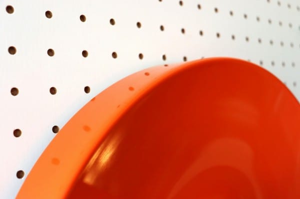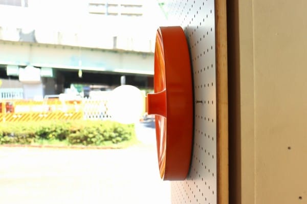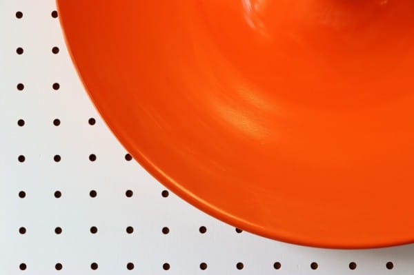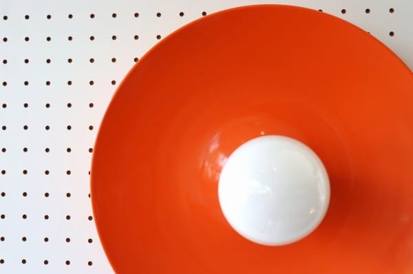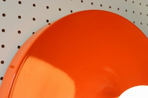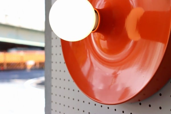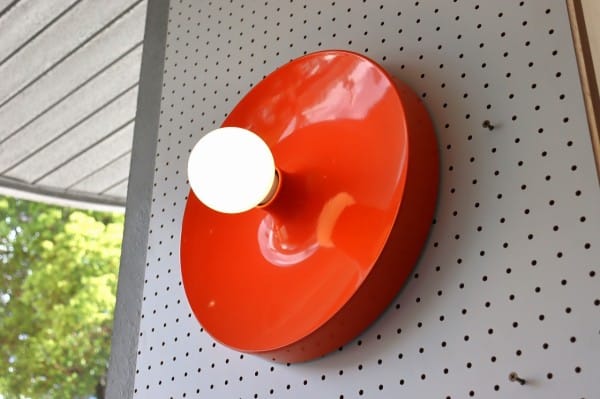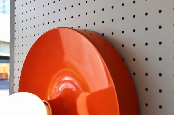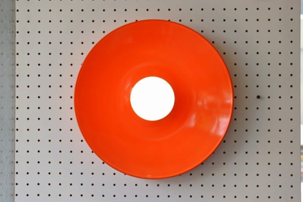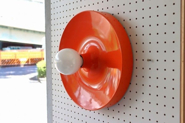 オレンジ色の円盤のようなスペースエイジ感たっぷりのランプ。丸いシルエットにしなやかな曲線のライン、中央から外へ向けて裾野のように広がるデザインです。