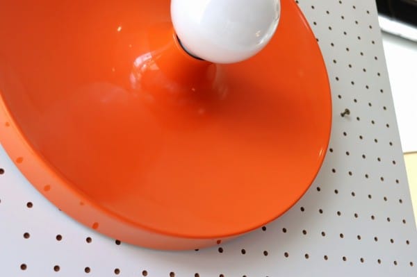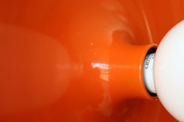 オレンジ色の表面は艶やかな質感で滑らかな肌触り。ランプを点灯させると電球の灯りに照らされ、より鮮やかな色合いに。