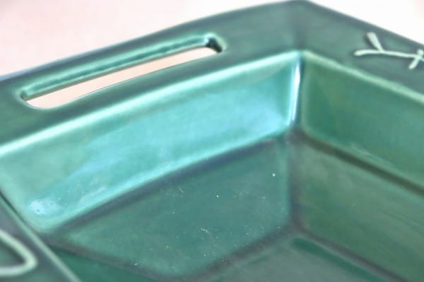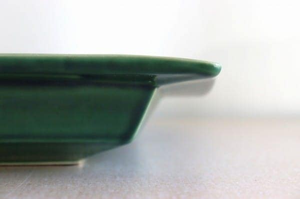 入隅が濃く、出隅が白っぽく明るく見えますね。釉薬の濃淡で様々なラインが見られるので単色でも単調にならず、ニュアンスが感じられます。落ち着いたトーンのグリーンも味わいがあります。