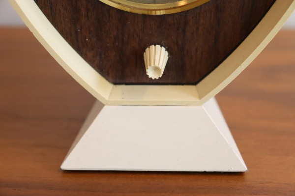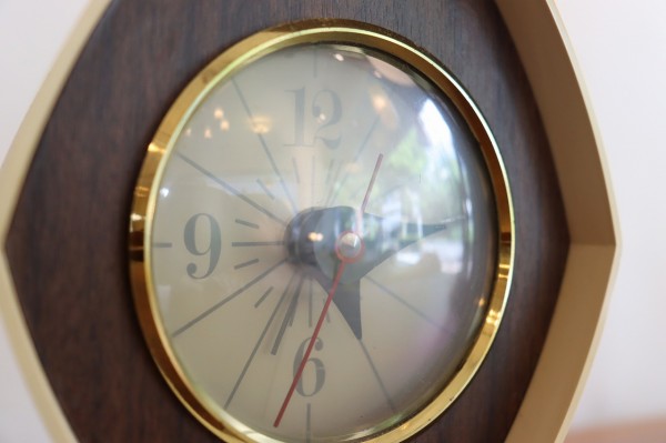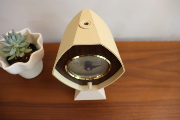 変形の六角形のボディに木目調のシートがレトロな佇まいです。木目に重なったゴールドのリングが渋く光ります。台座に重さがあり安定感も問題ありません。