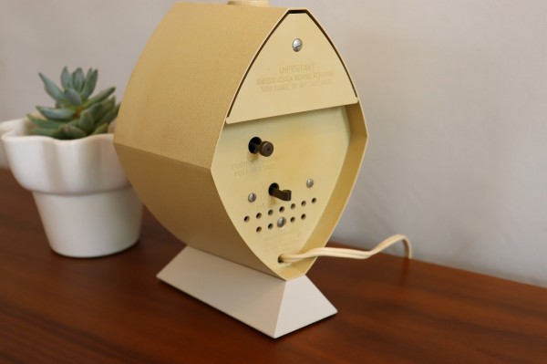 こちらの時計の特徴は投影機能がついていて、上部からプロジェクターのように時刻をデジタル表記で天井に映しだしてくれますが、残念ながら、電球が特殊で見つけることができませんでした。