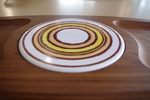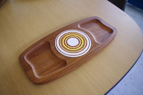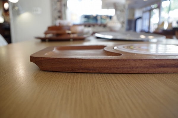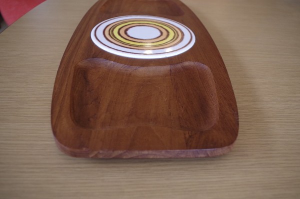 タイル&ウッドトレー。丸いタイルが埋め込まれた木製トレー。