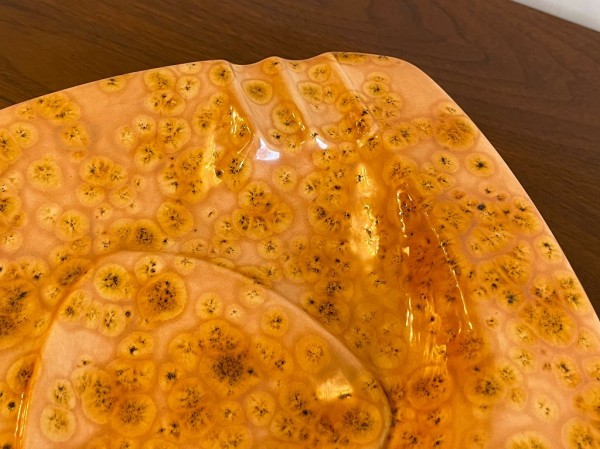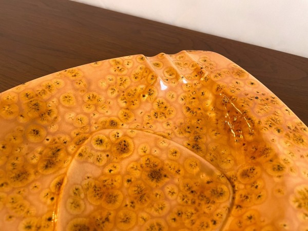 ピンクとオレンジを混ぜたような色合いで、釉薬の溶け方が小さな花が咲いているように見え、可愛らしい雰囲気を感じられます。