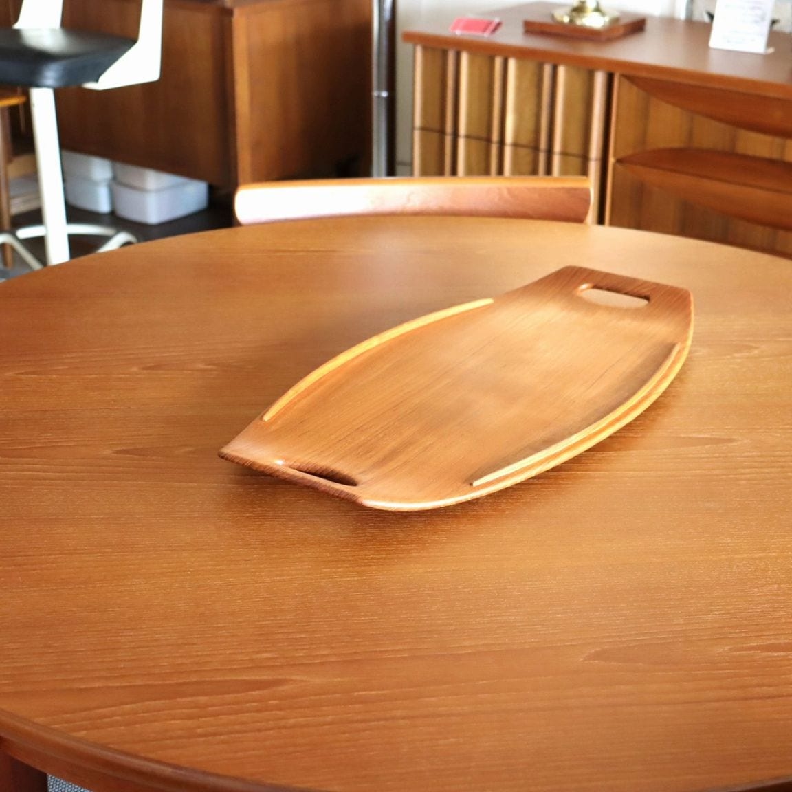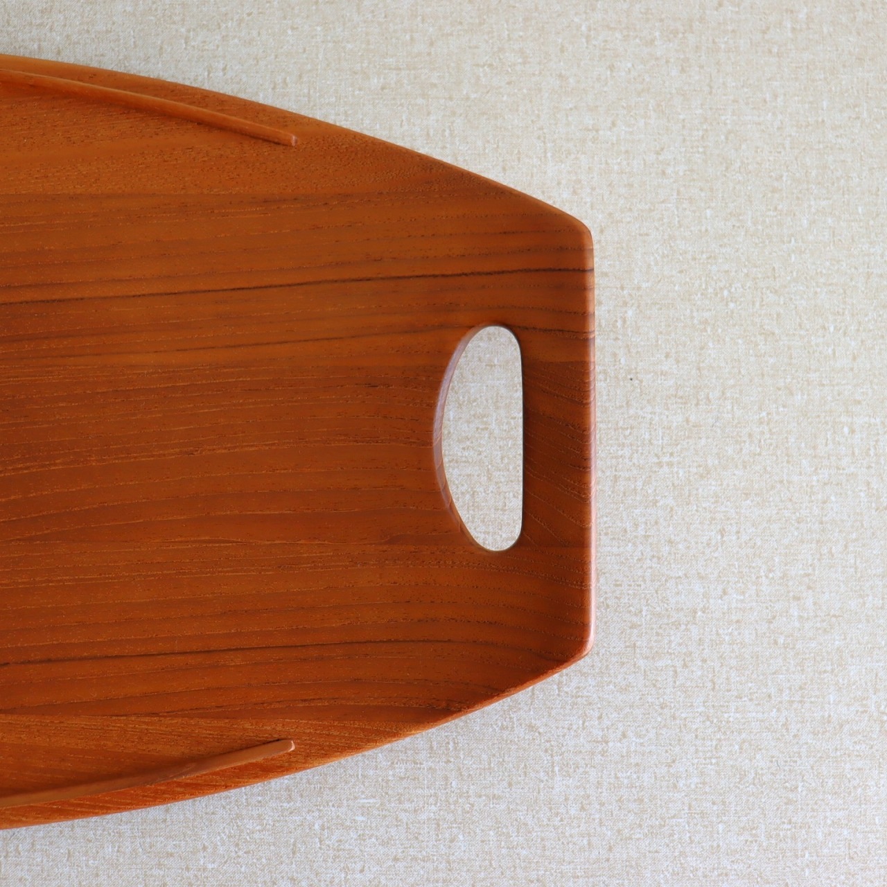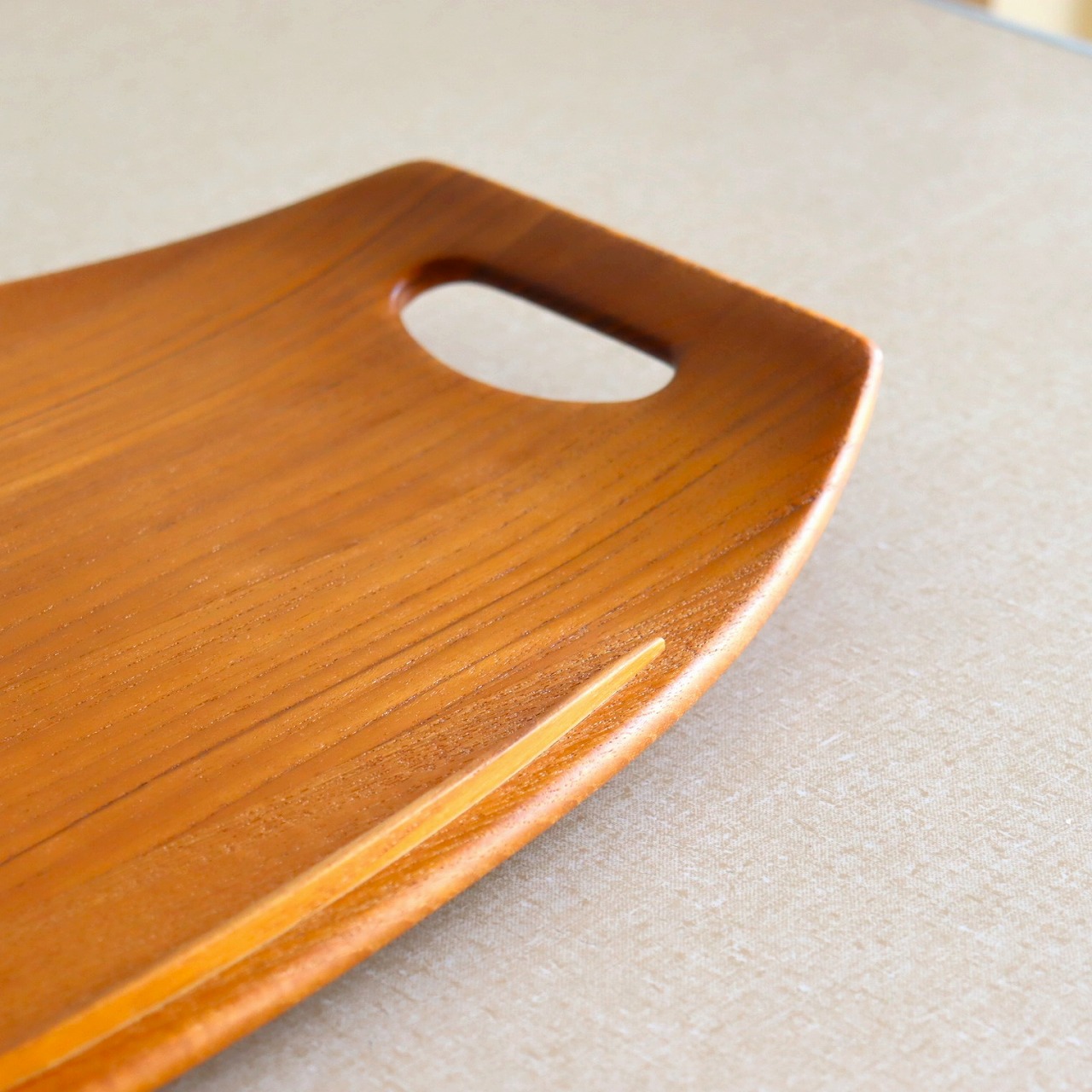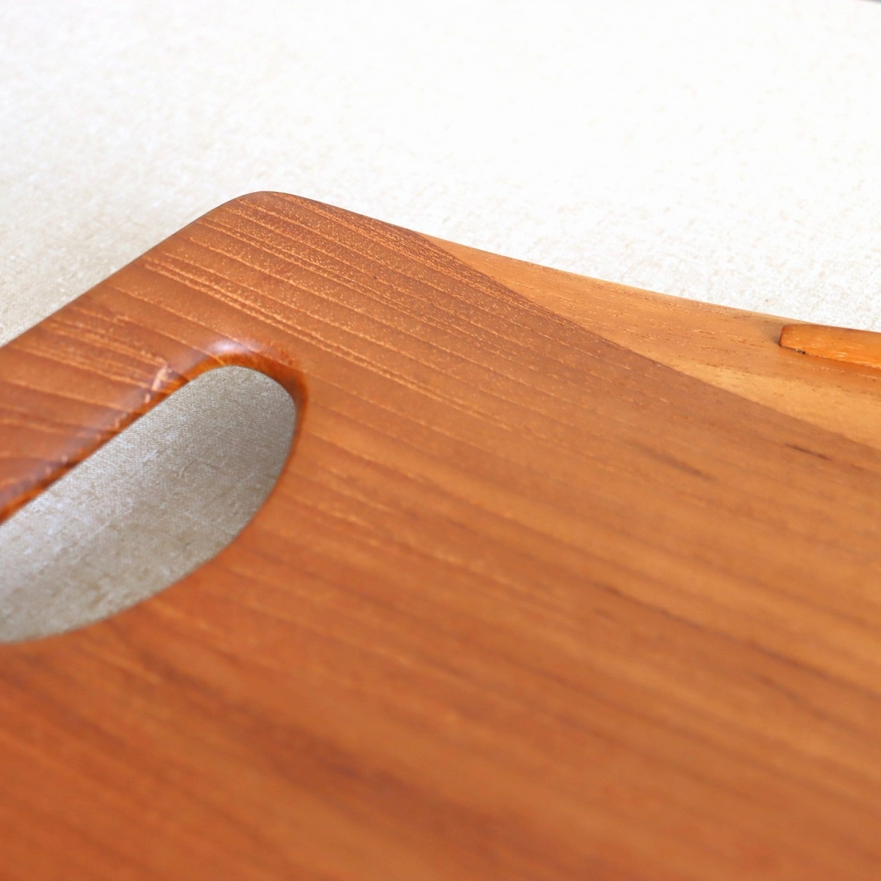 チーク材を用いたサービングトレー。北欧家具に引けを取らない滑らかな流線形がとても美しく、少し反り上がった形は持ちやすさだけでなくデザインとしても秀逸です。