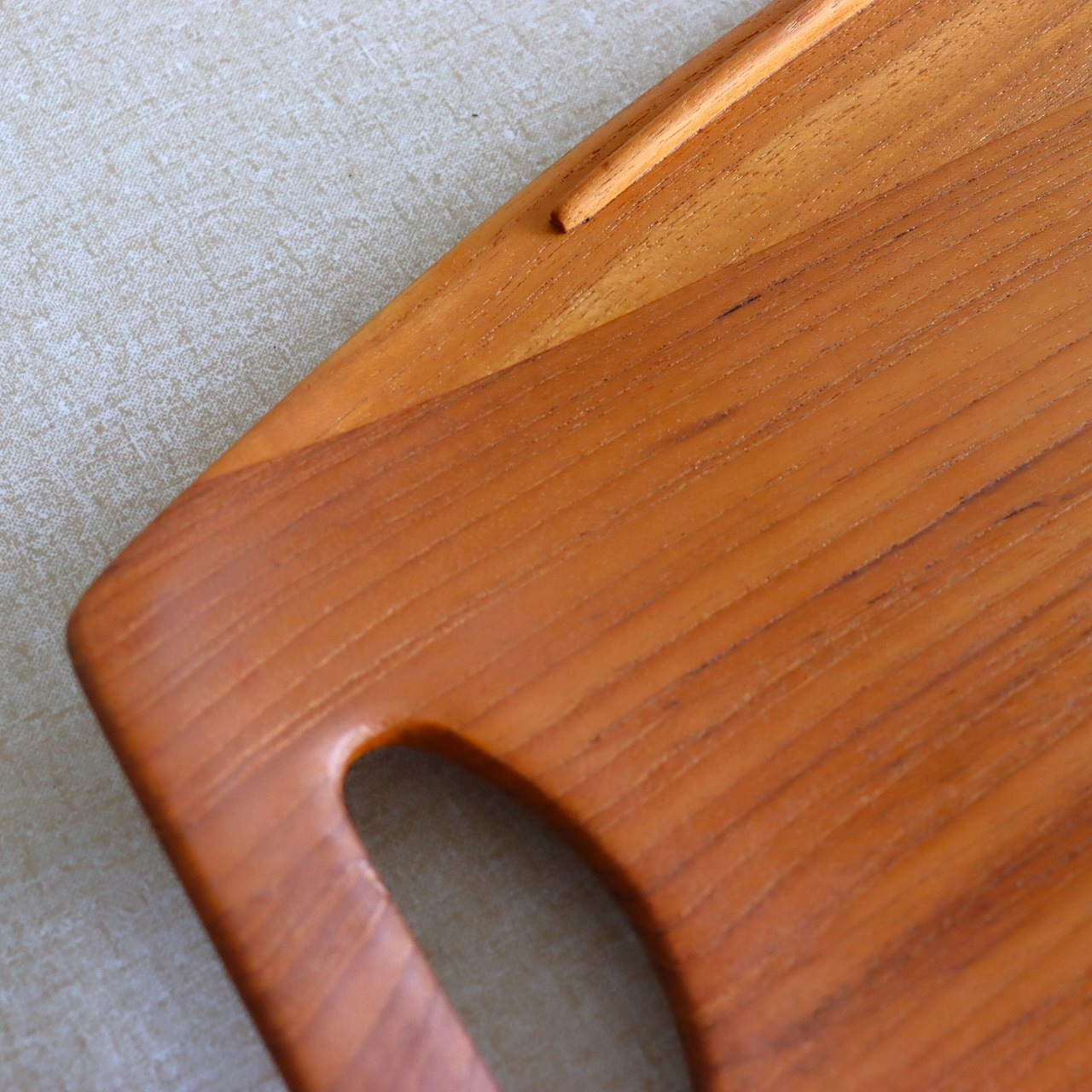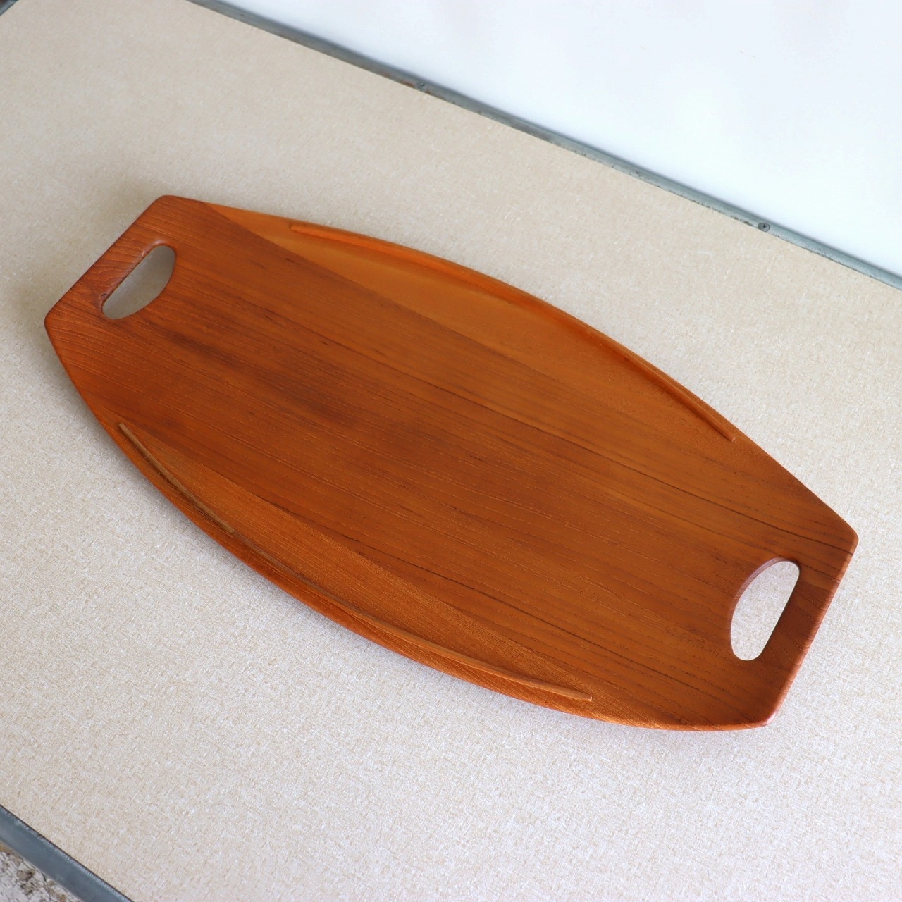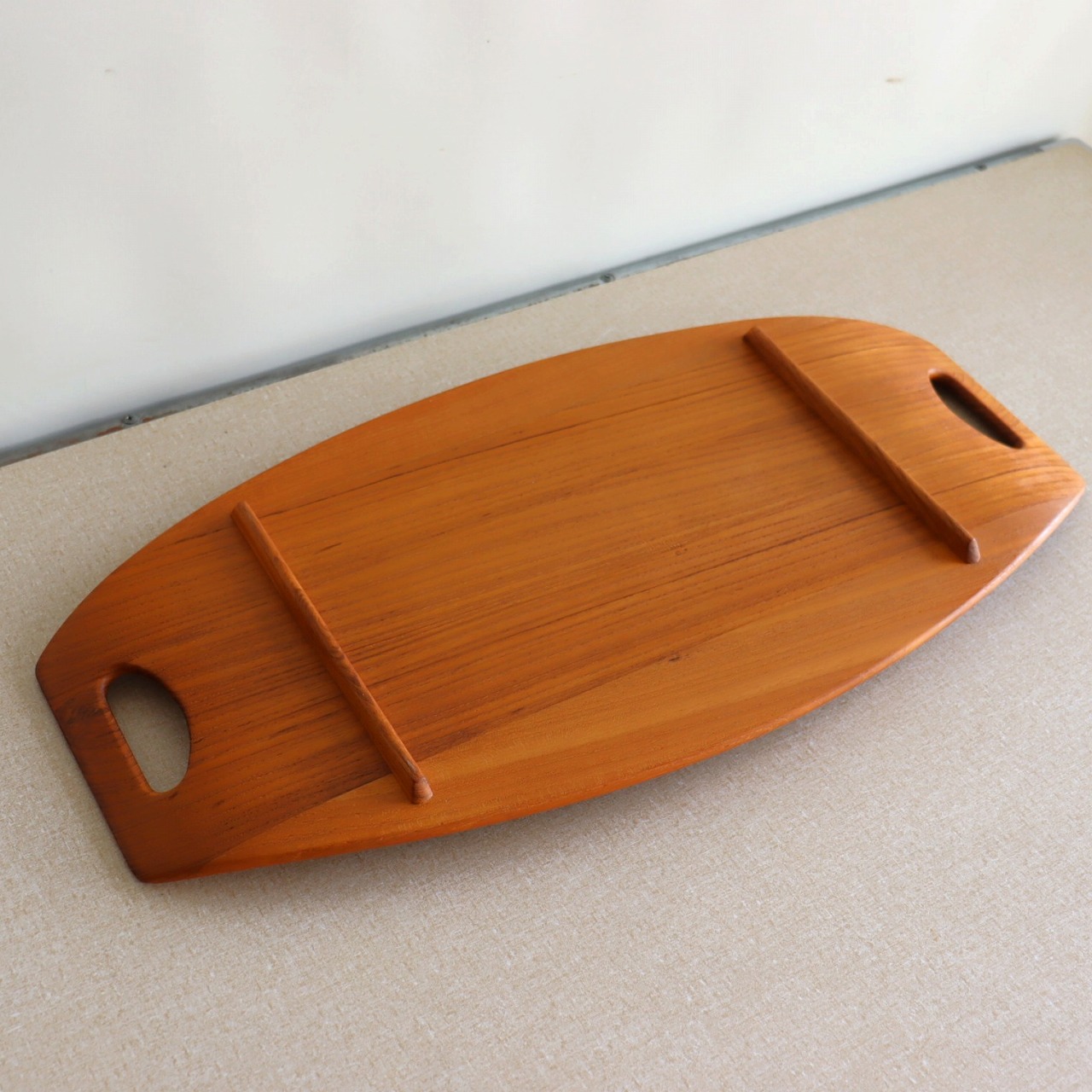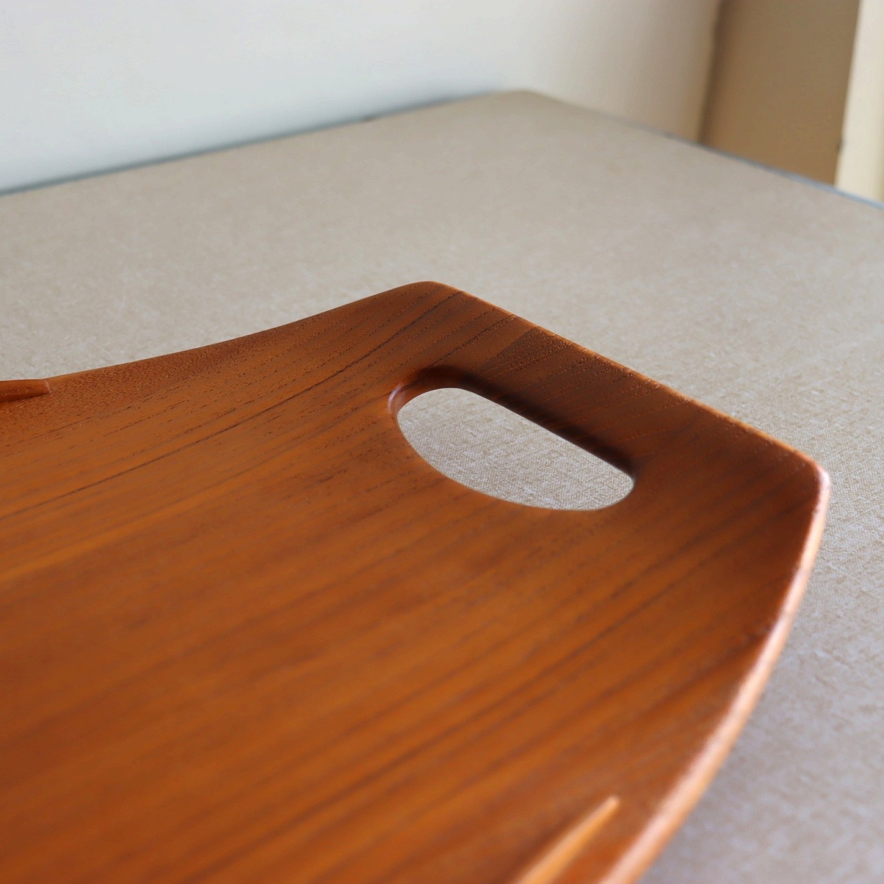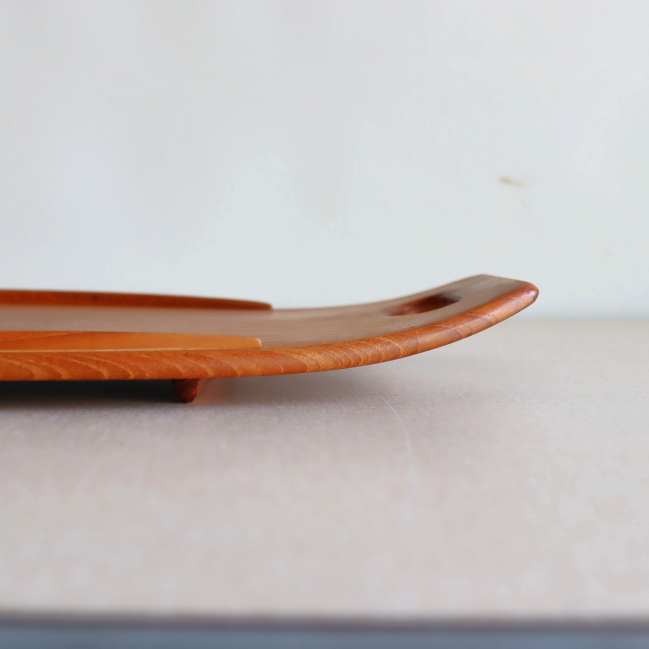 チーク材を用いたサービングトレー。北欧家具に引けを取らない滑らかな流線形がとても美しく、少し反り上がった形は持ちやすさだけでなくデザインとしても秀逸です。
