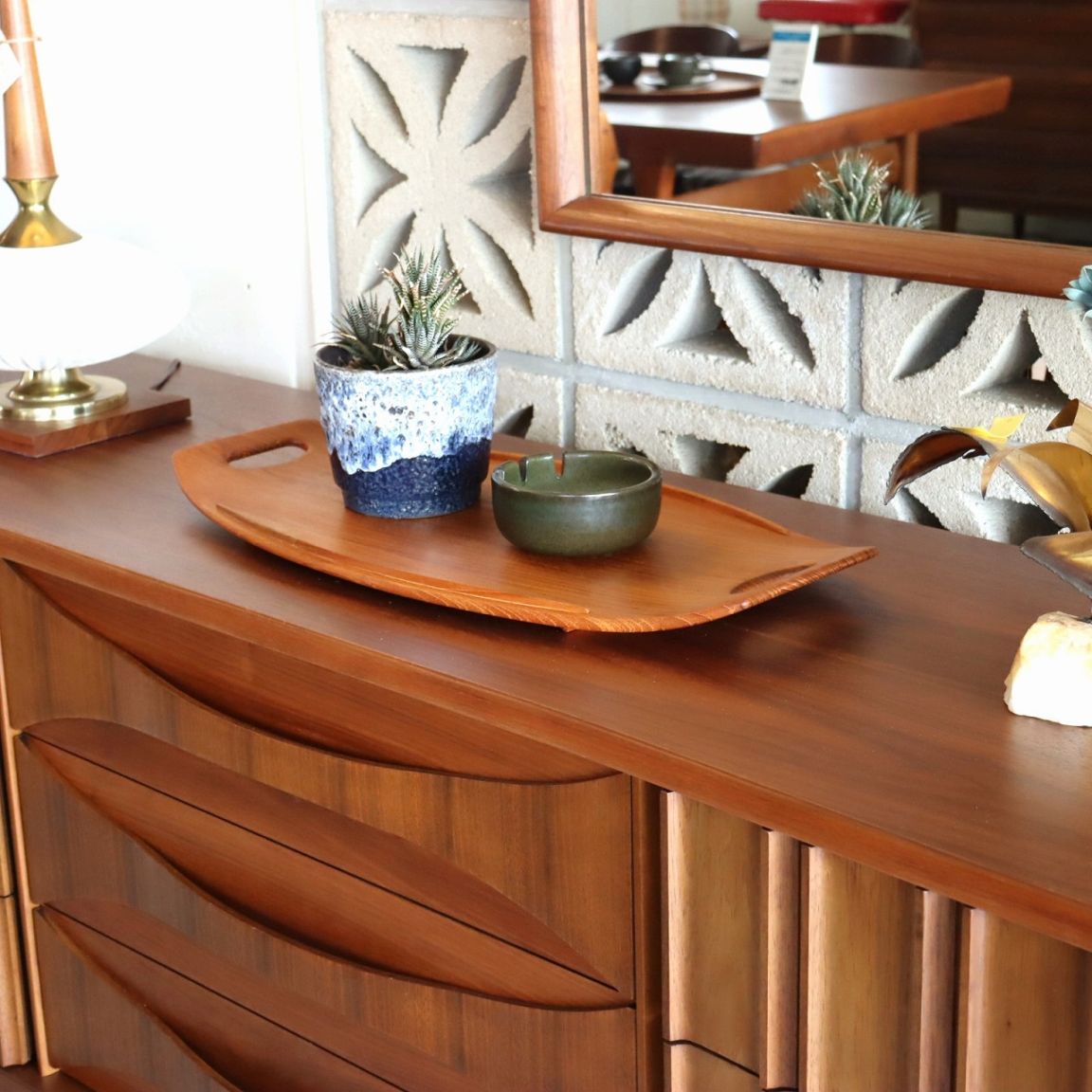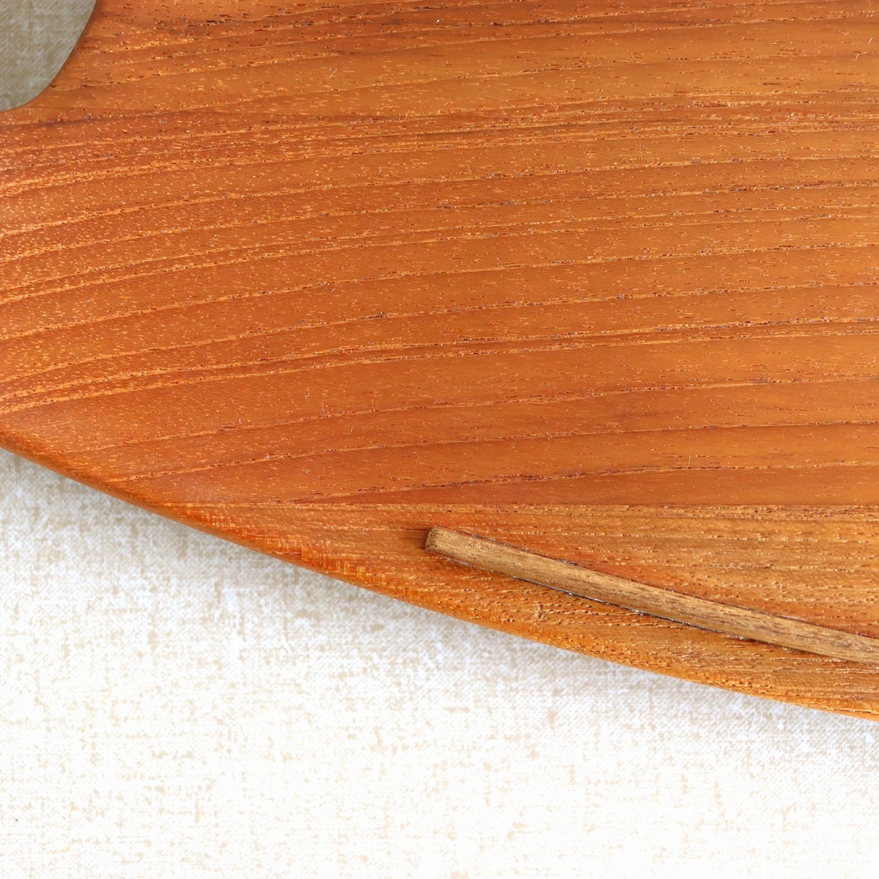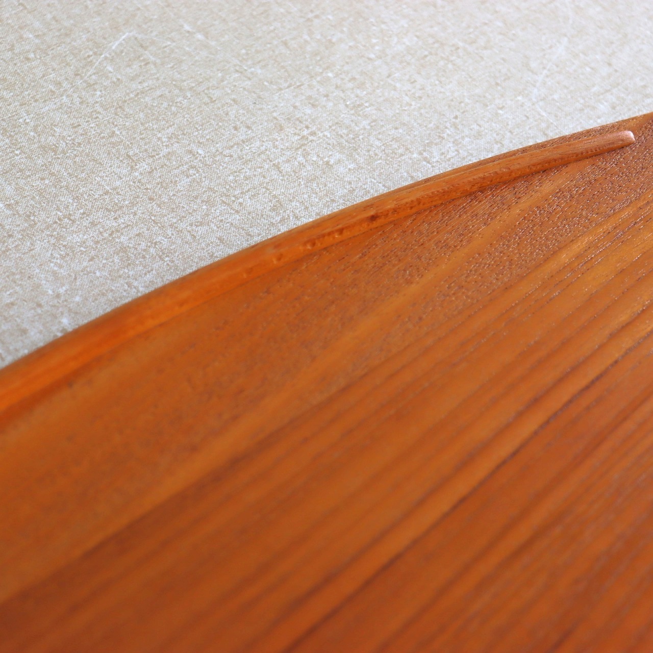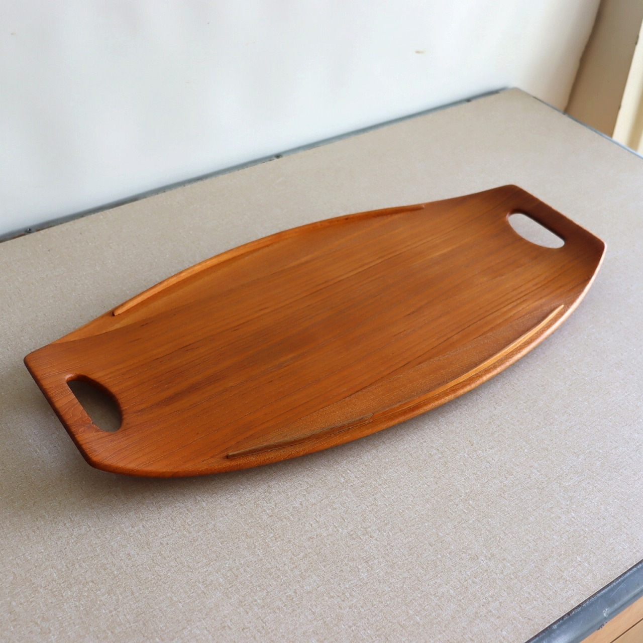 チーク材を用いたサービングトレー。北欧家具に引けを取らない滑らかな流線形がとても美しく、少し反り上がった形は持ちやすさだけでなくデザインとしても秀逸です。