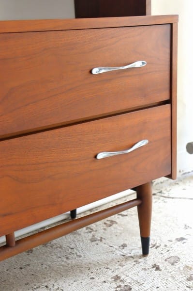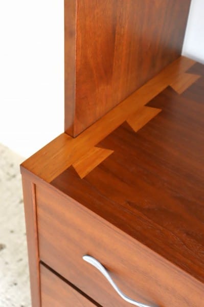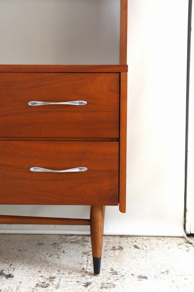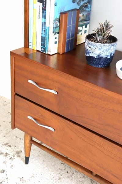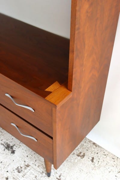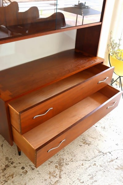下部は引出し2段。引出しの取っ手はスプーンシェイプ形で、他の取っ手と同じシルバートーンで統一されています。天板のダブテイル模様もインテリアにアクセントを加えてくれますね。