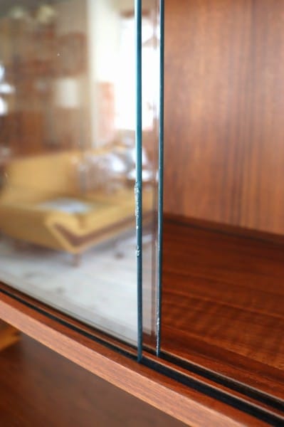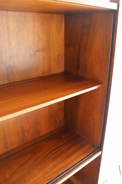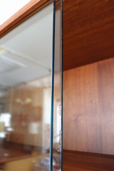 素材はウォールナットとオーク材。ガラス戸内の下段に輪ジミがあります(写真)。下段天板に凹みキズがあります(写真)が、上段を設置するとほとんど隠れるものです。