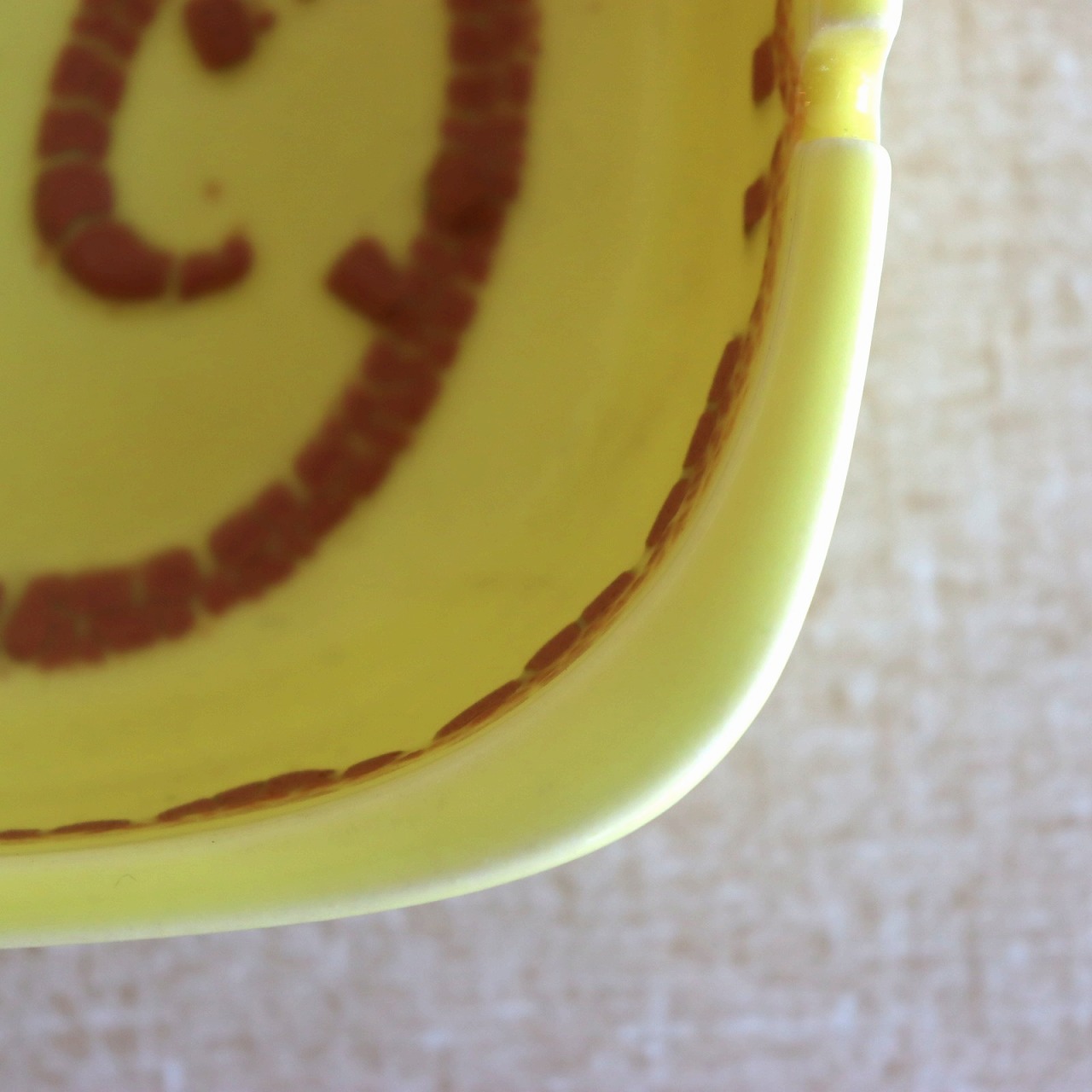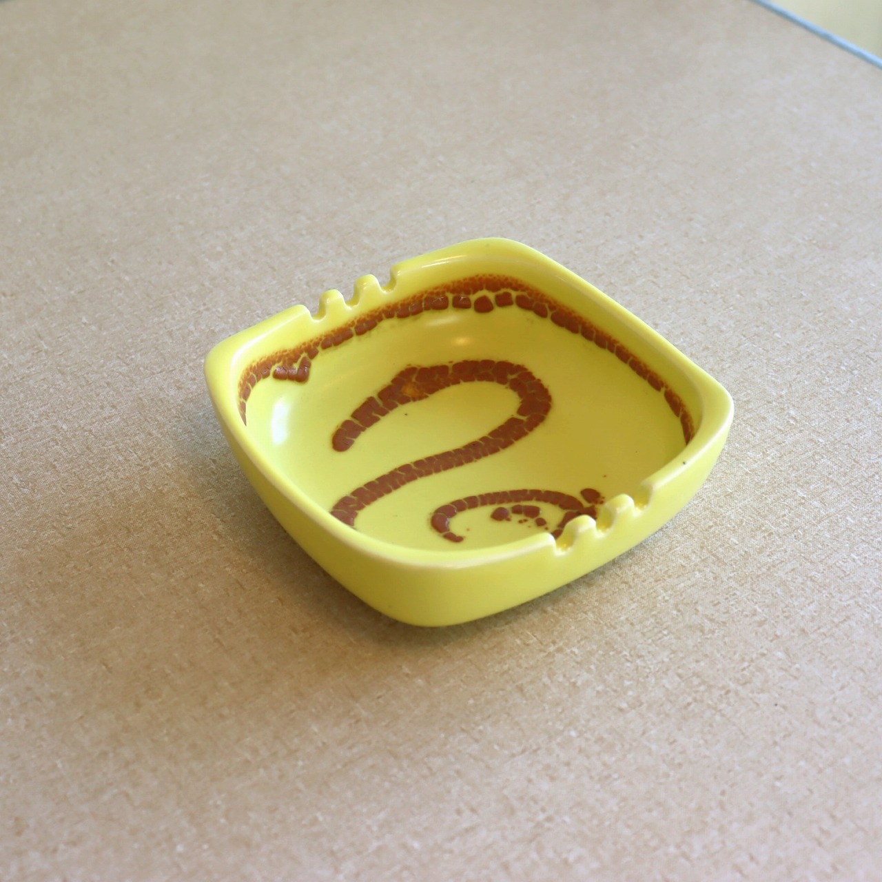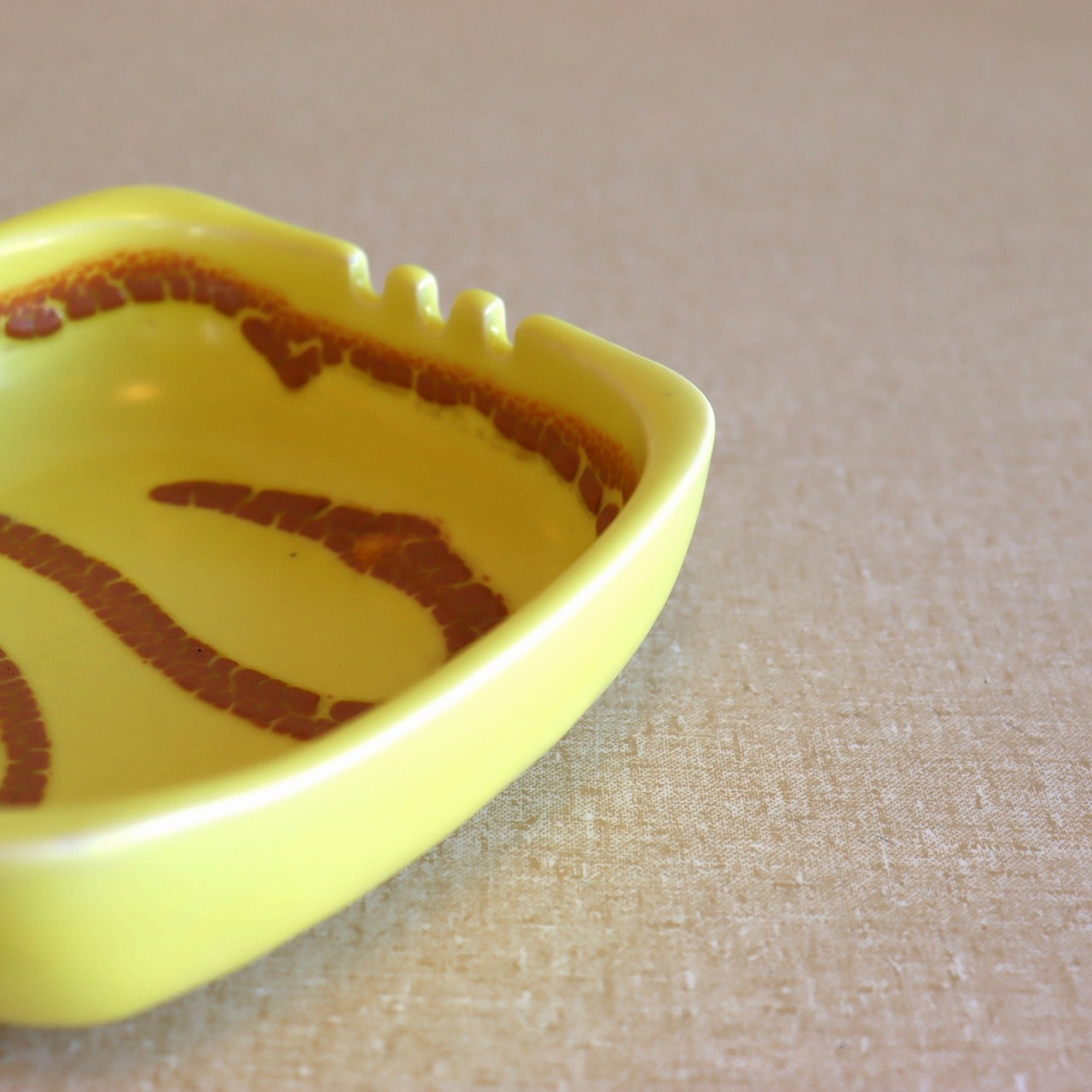 明るいイエローカラーが特徴的なアイテム。艶やかな質感の表面にブラウンのデザイン。凹凸のある味わい深いうろこのような模様が美しいコントラストを生んでいます。