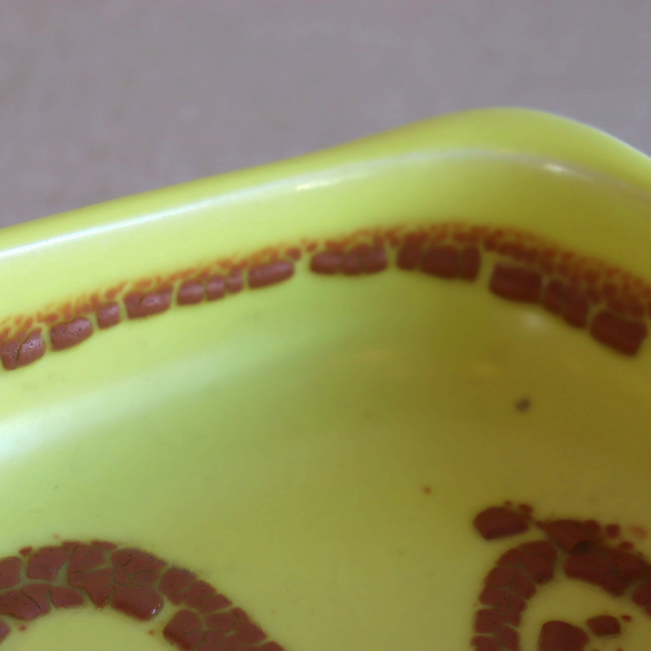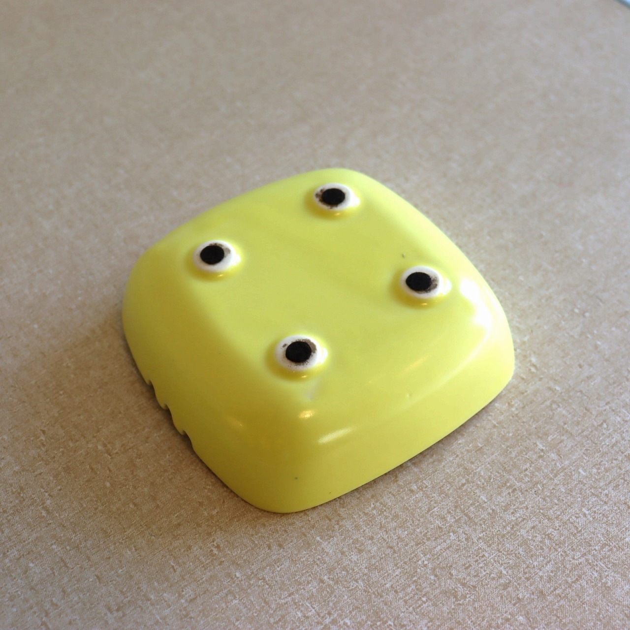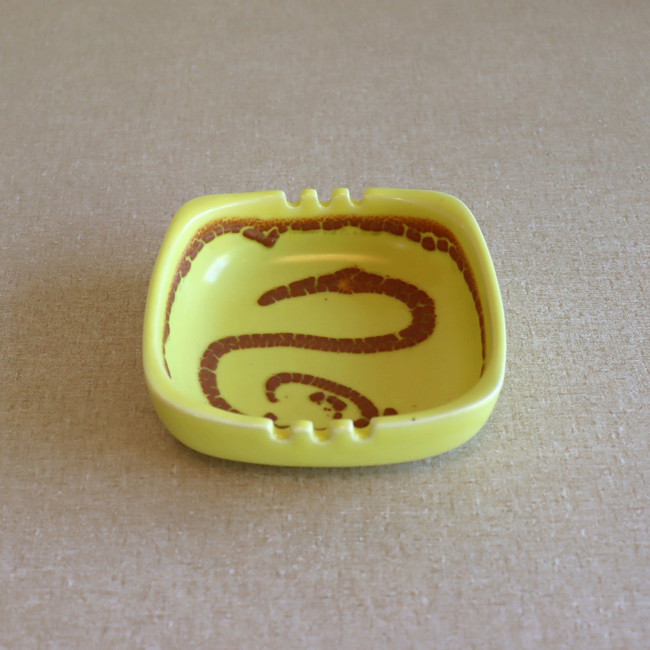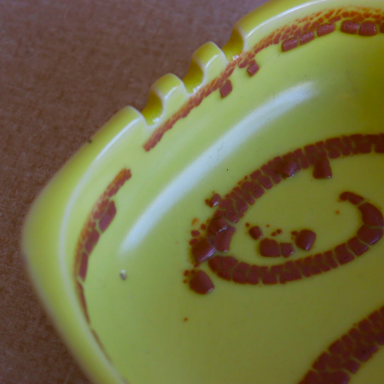 明るいイエローカラーが特徴的なアイテム。艶やかな質感の表面にブラウンのデザイン。凹凸のある味わい深いうろこのような模様が美しいコントラストを生んでいます。