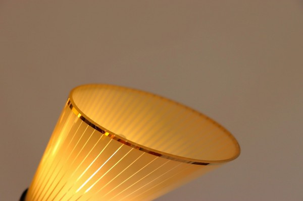 アームの先にストライプのガラスシェードが上向きについています。ガラスシェードのゴールドに縁取りされていて、まるでティーカップのよう。可憐で華奢な雰囲気です。