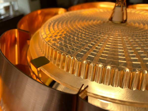 側面の透過のアクセントにも同じような粒のプレートが付いています。シェードで包まれているデザインで、光が抜ける構造なので、部屋全体を優しく照らしてくれます。