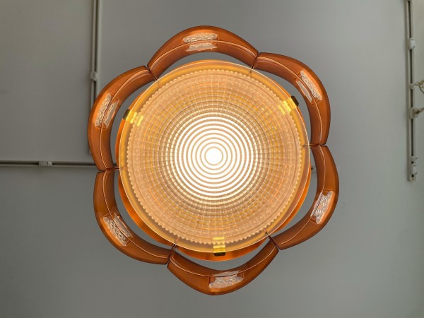 ランプ上下ともにプラスチック製のプレートが施されていて、細かい粒のようなデザインは電球の灯りを優しく投影してくれます。