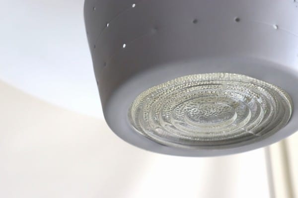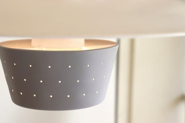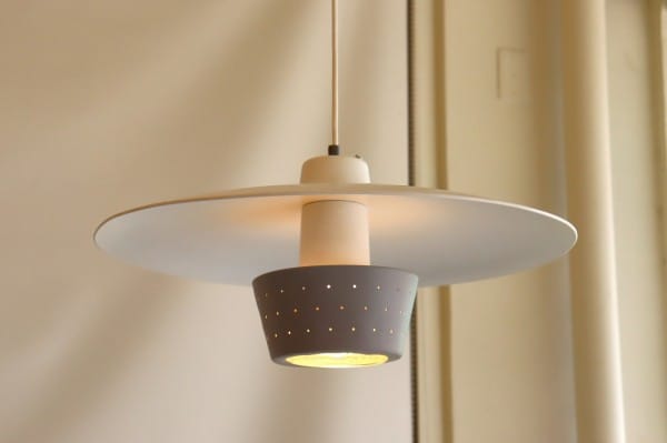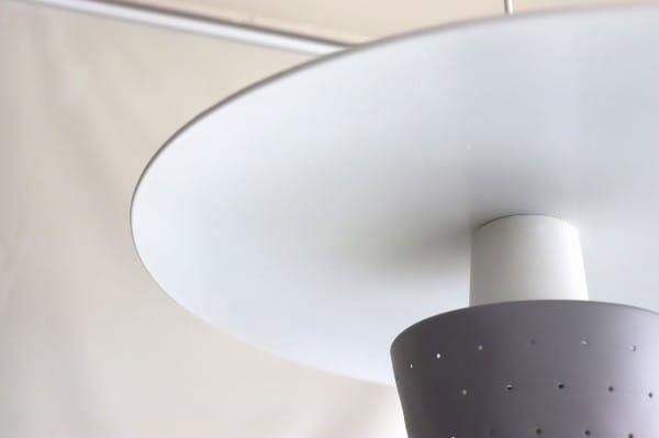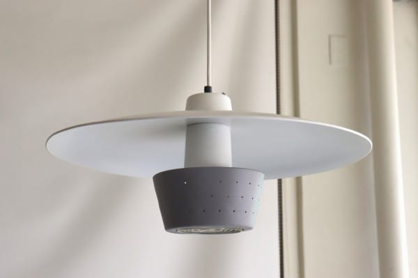 円盤型のシェードと筒状のシェードからなる、北欧デザインのペンダントライト。シェードの下から筒状のパーツがすらっと伸び、すっきりとシャープな印象でありつつ、パンチングが施されたグレーのシェードによって可愛らしさもあります。