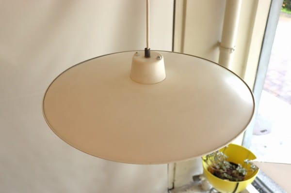 ペンダントランプ。円盤型のシェードと筒状のシェードのバランスが美しい印象的なランプです。