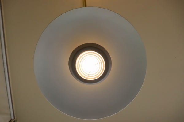 グレーのシェード下部からは下方向だけでなく、上部に向かっても光が放たれており、円盤型のシェードに反射している様子が美しく、カップ部から点灯する光が、シェードの内側に反射し明るくなる設計です。