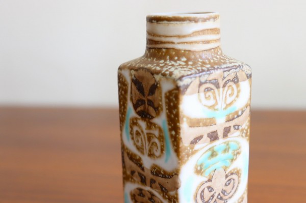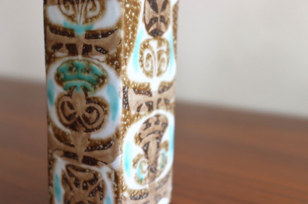 柱型のシルエットで口が丸く、シンプルなつくりです。絵柄が続いているので置く向きによって雰囲気も変わります。ハンドメイドならではの絵柄の微妙なニュアンスも素敵ですね。