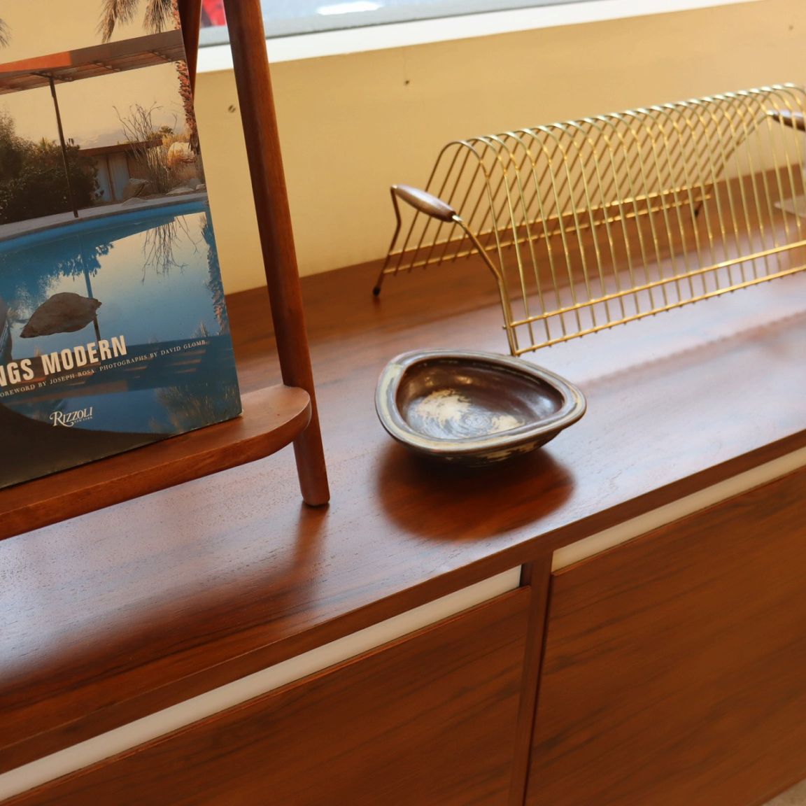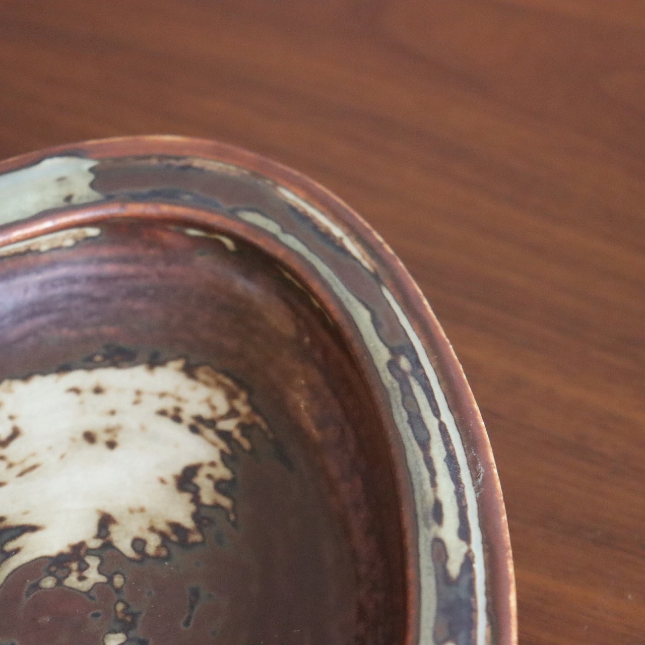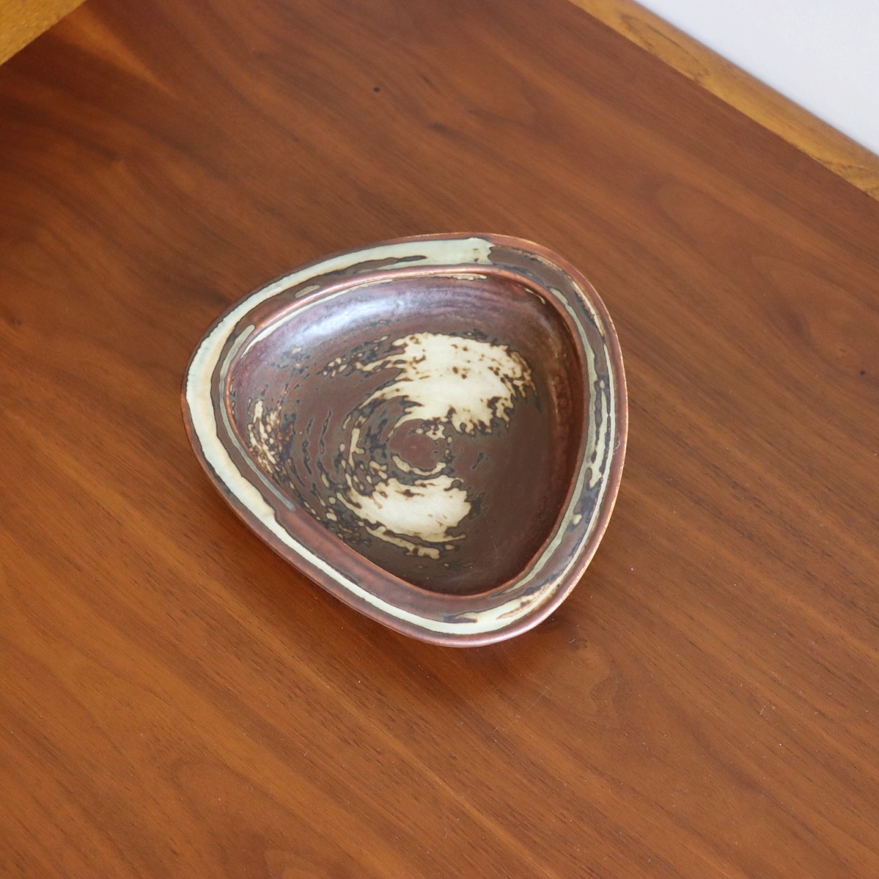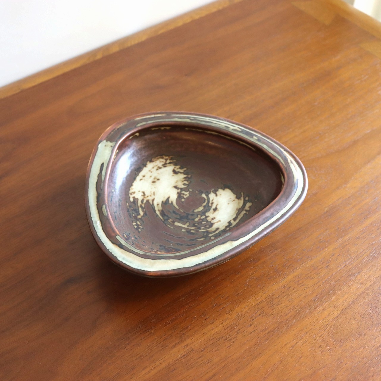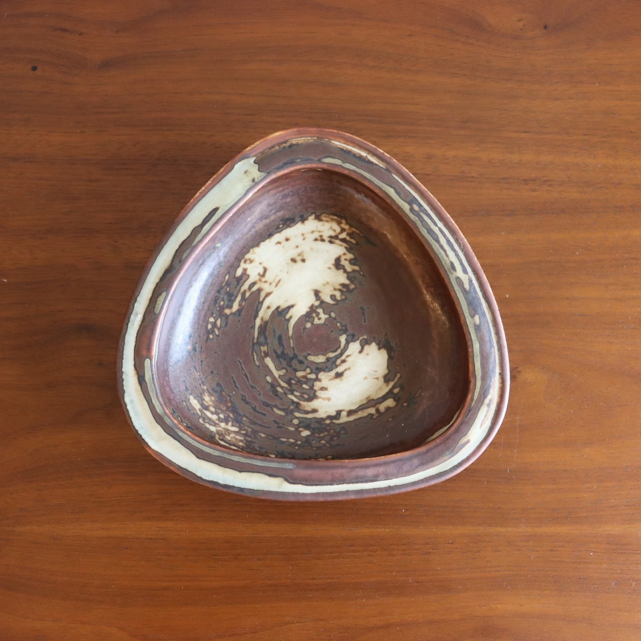 落ち着いたトーンの配色と複雑な模様が北欧らしい一枚。厚みと重量感を感じられる、丸みがかった三角形のフォルム。落ち着いていながらデザイン性も感じられますね。木の家具に飾ったり無地系のものを乗せると引き立て合って素敵な飾り方が出来そうです。