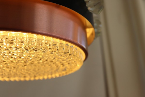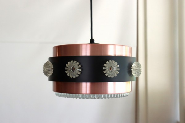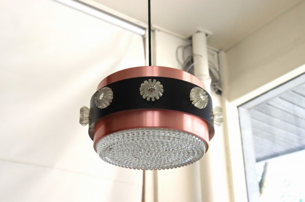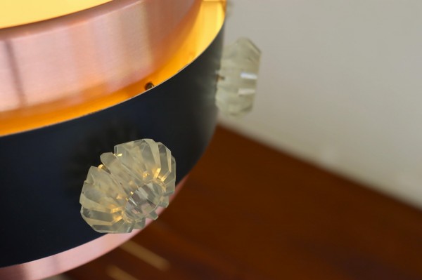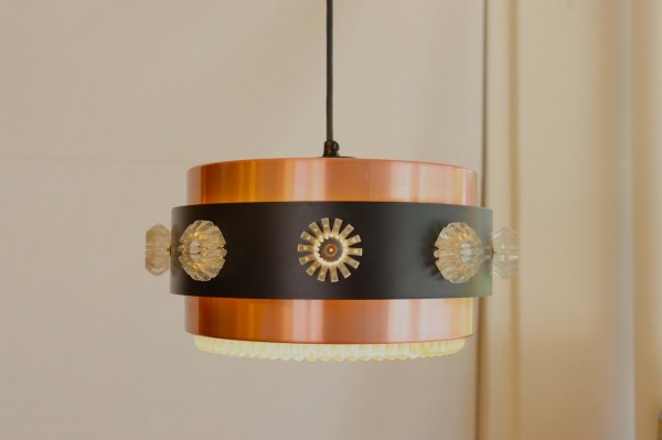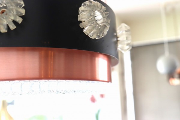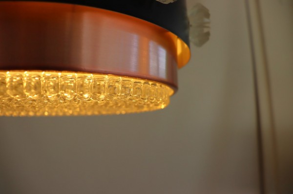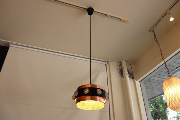 カッパーのシェードにブラックの帯が巻かれたデンマークビンテージランプの特徴的なデザインです。隙間から漏れるあたたかな光がグラデーションとなってシェードを照らします。上質で落ち着きのある空間を演出することが出来ますね。