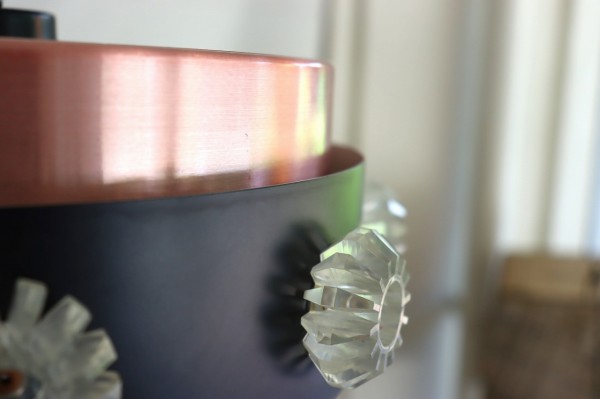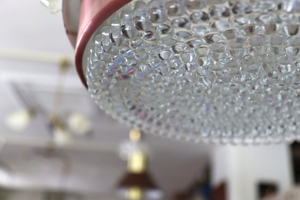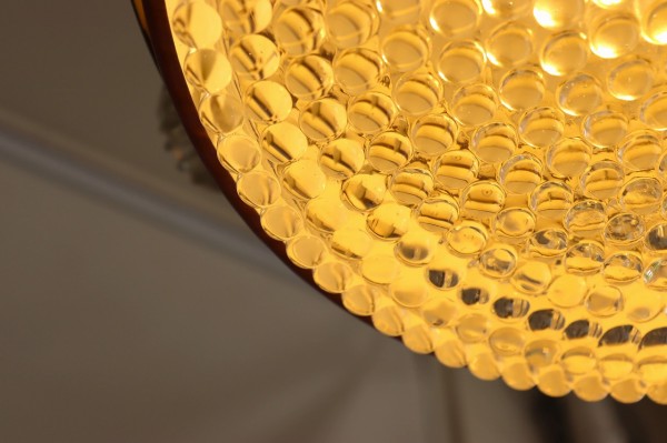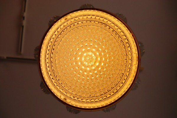 下面はガラスのシェードが施されています。水滴のような細かな粒が中心から放射状に広がっていて、点灯時にはキラキラと煌めく灯りが楽しめます。艶やかで柔らかい質感のガラスは消灯時でもなお綺麗ですね。