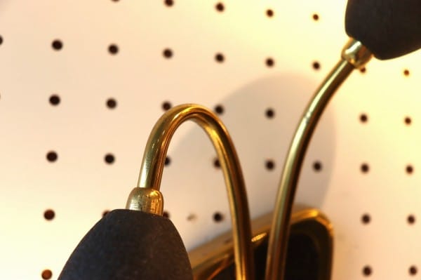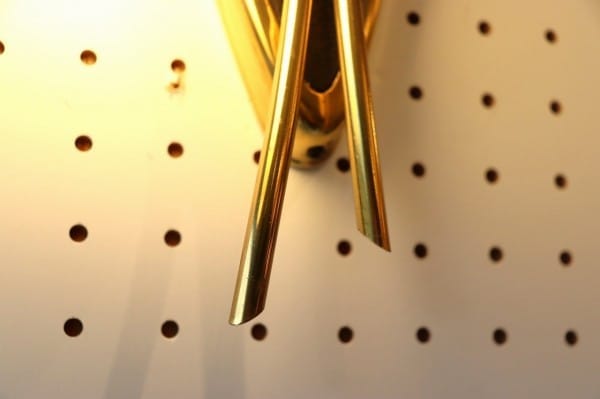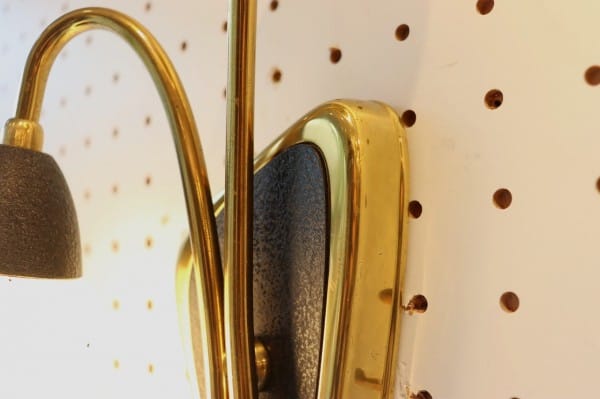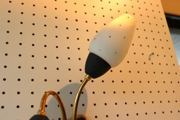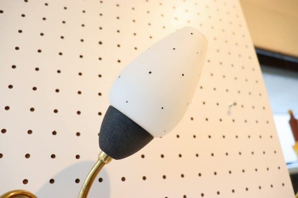 ベースやシェードの土台にはマットな質感でブラックの塗装が入っておりモダンな佇まいに。ベースは逆三角のデザイン。シェードにも小さなドット柄の模様が描かれていて、ドイツ1950年代らしいブラック×ゴールドの力強いデザインです。
