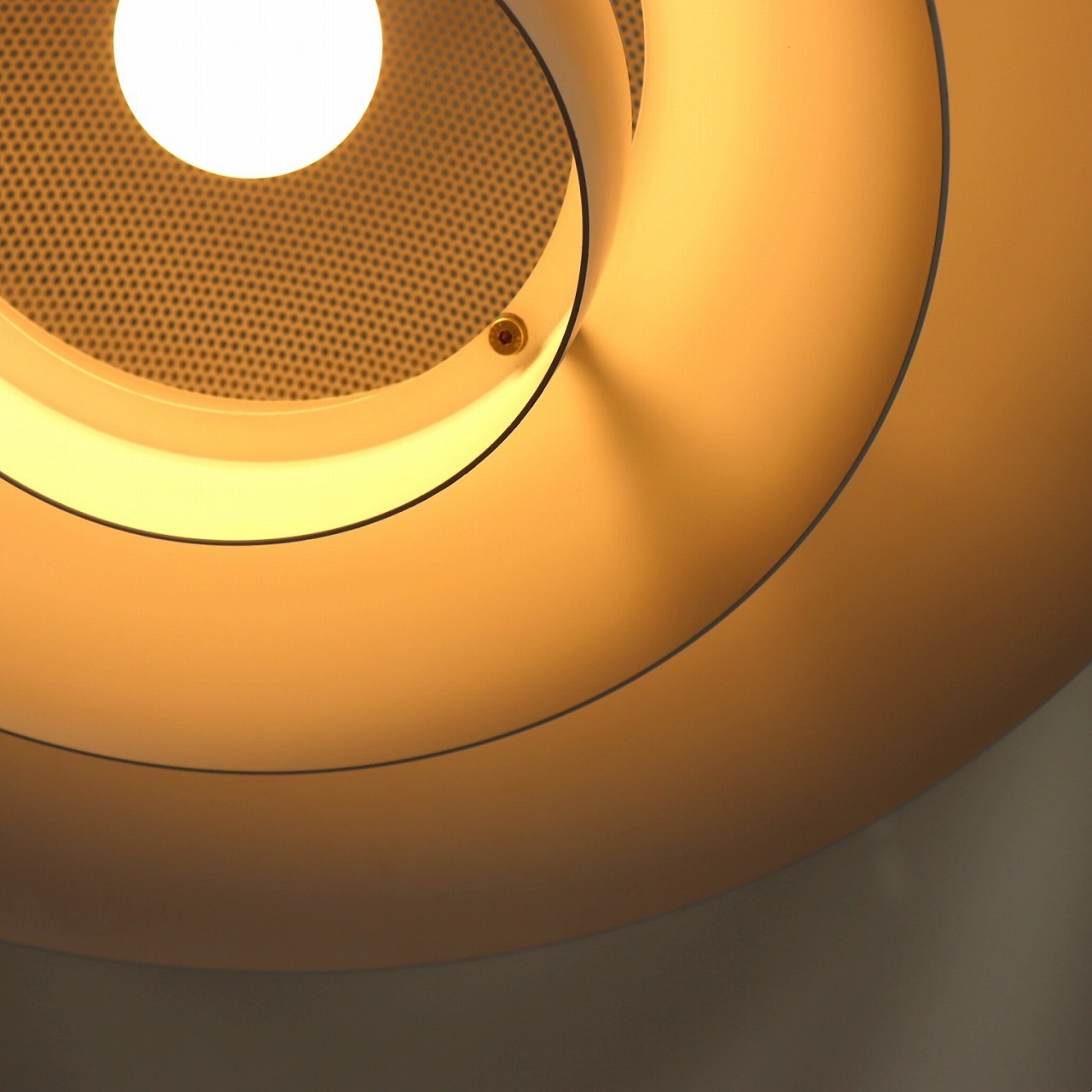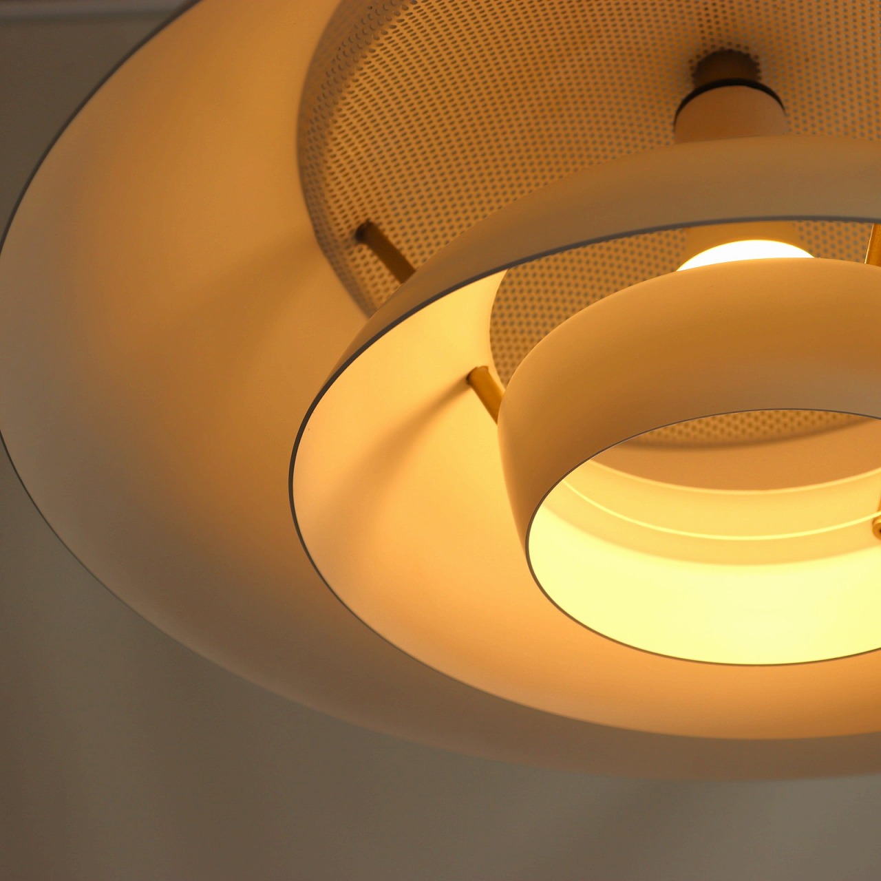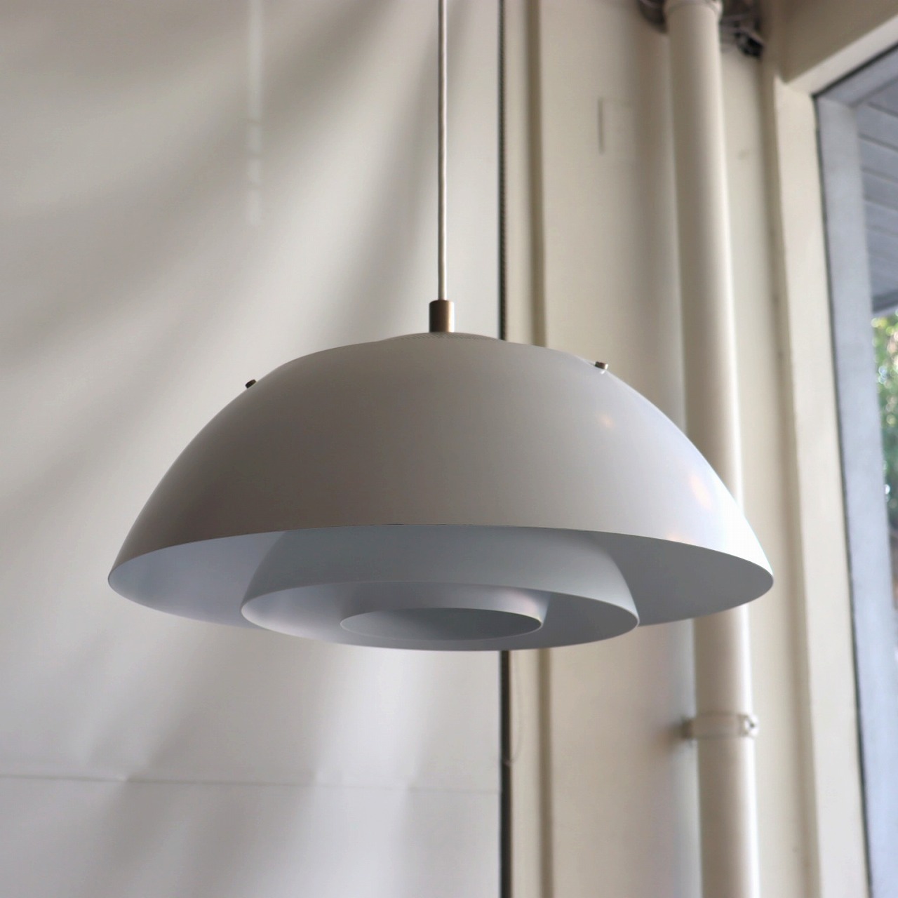 半球型の大きなシェードの内側にさらに小さなシェードが2つ重なったデザインで、大きさが異なるシェードを重ねたデンマークらしいデザイン。内側のシェードに照らされた光の濃淡とグラデーションが美しく魅力的なランプです。