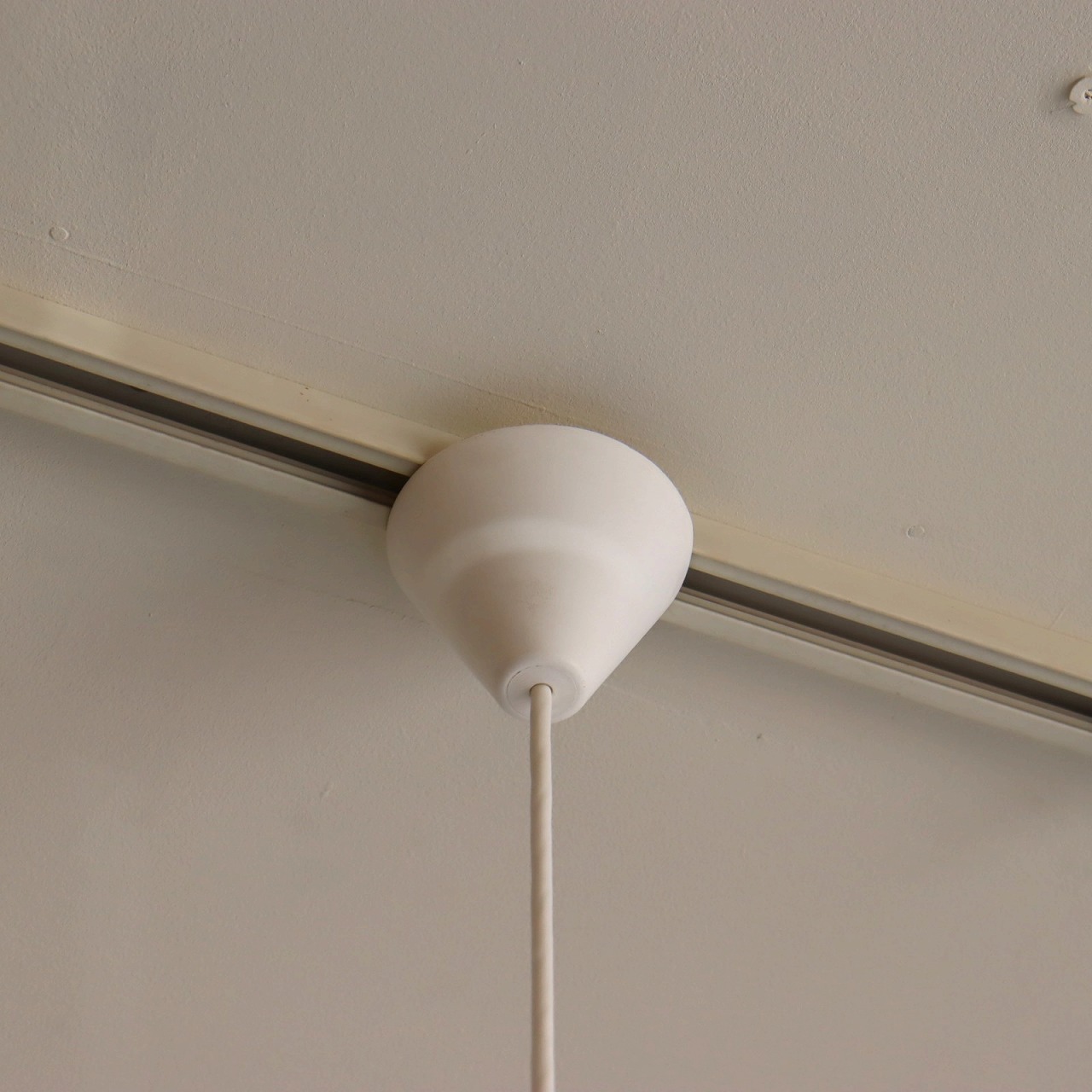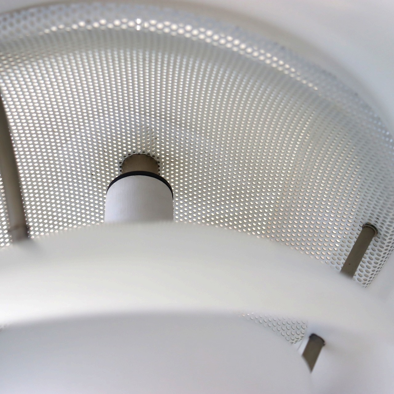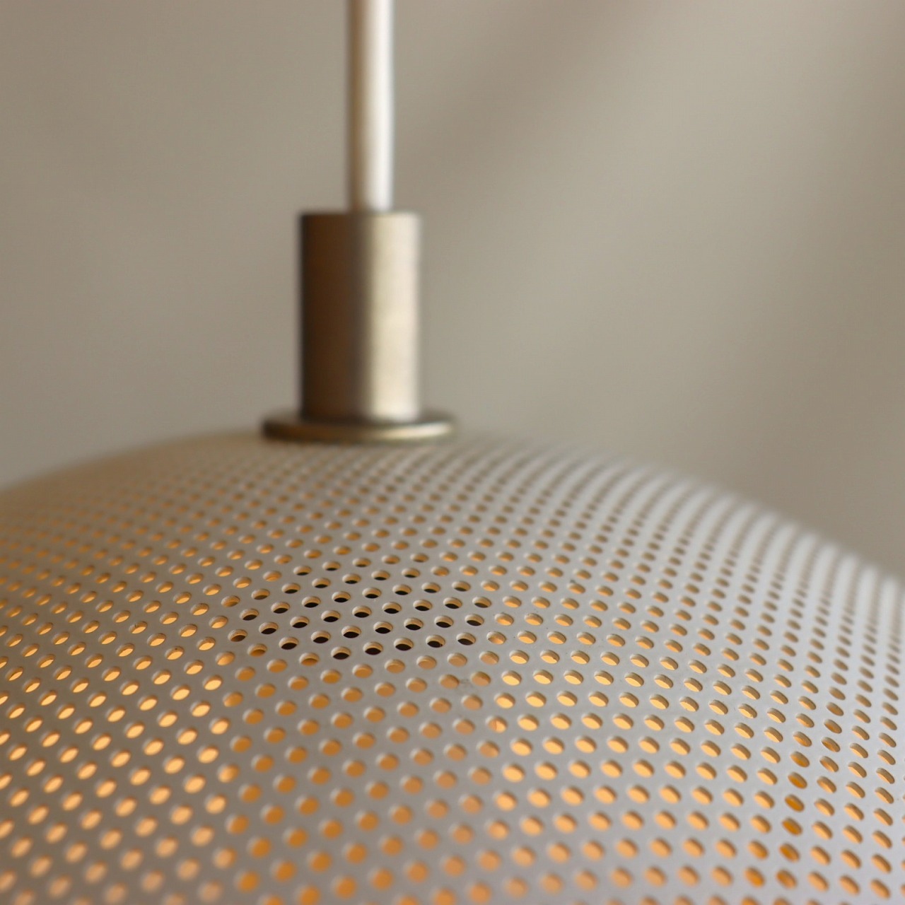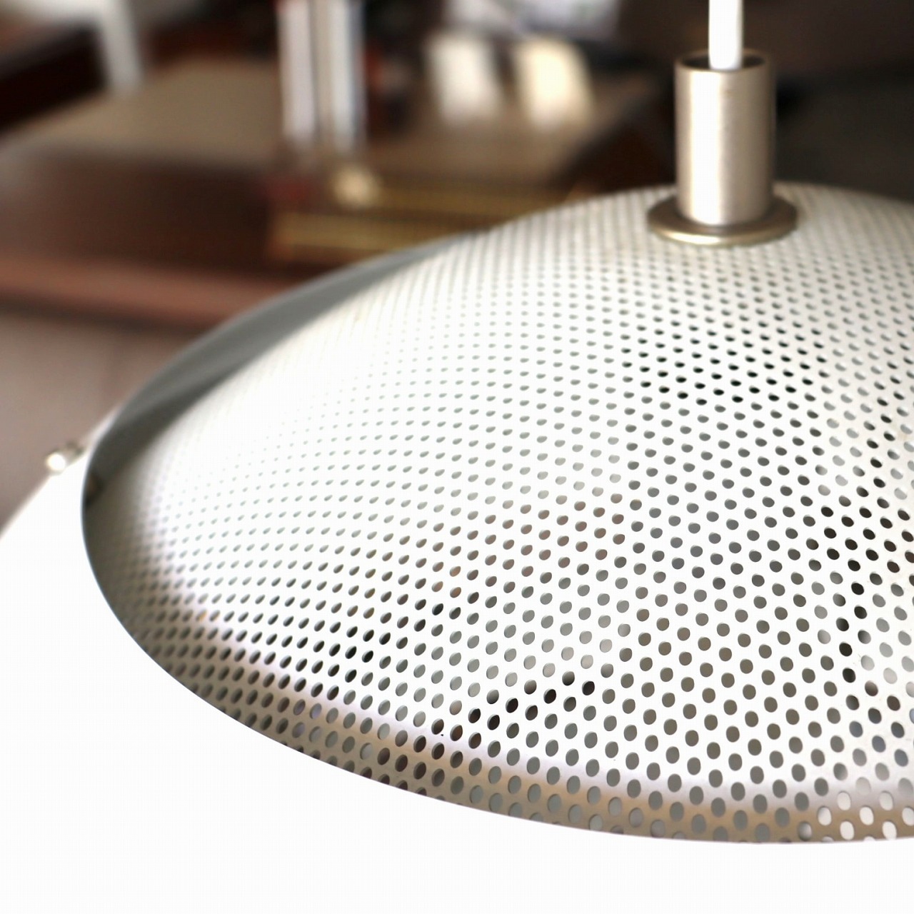 シェードの上部はパンチングメタルとなっているため、上部にも灯りが漏れます。机の上などに設置すると、ペンダントライトのため机に光が落ちるのはもちろん、空間全体もふんわりと明るくしてくれそうです。