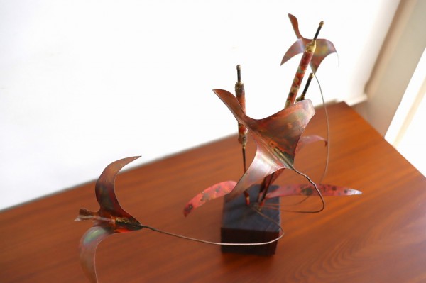 三羽の鳥と蒲の穂がモチーフ。真ん中から外にかけて広がりのあるバランスの取れたデザインです。ハンドメイドならではの個性的なディテールと溶接された金属の質感も素敵です。