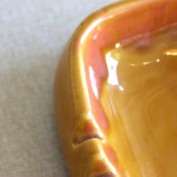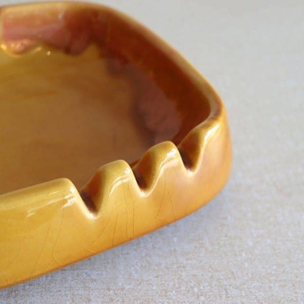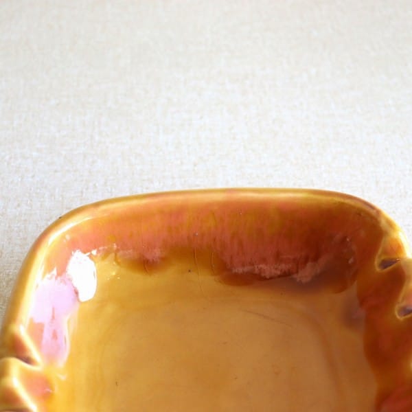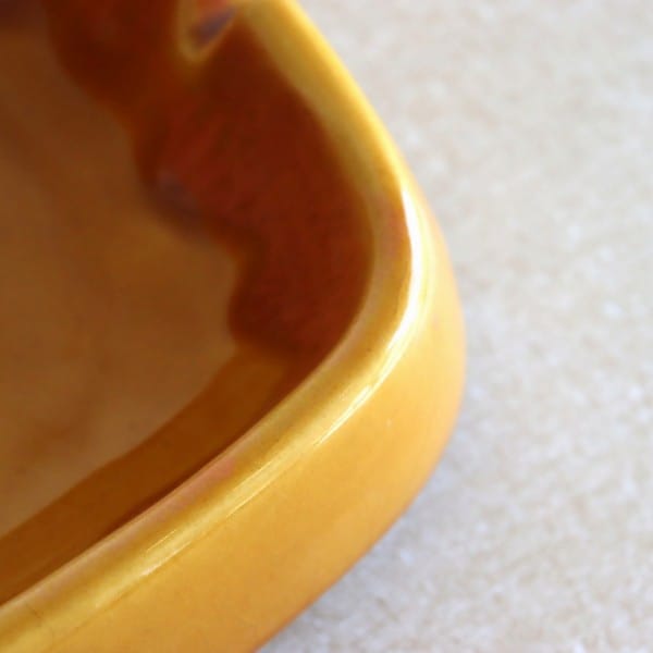 オレンジに近いからし色のレトロな雰囲気のあるこちら。内側には上から、より濃い釉薬が垂れています。形はシンプルな正方形です。