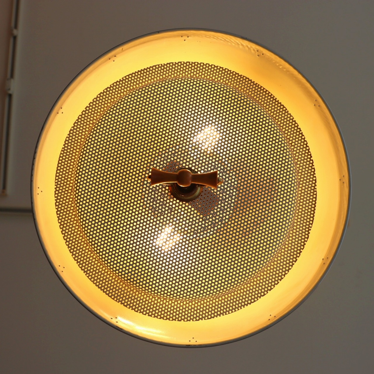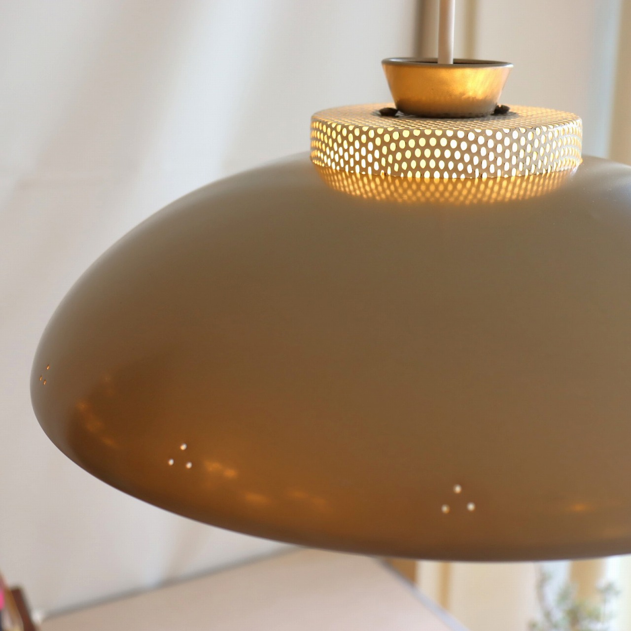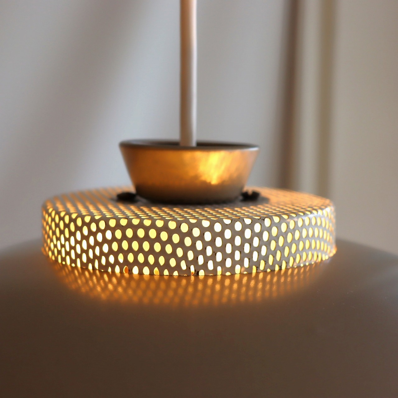シェードトップにもカップがついていて、こちらにもパンチング穴があいています。熱抜きの穴から光が漏れるので、その光がカップ側面のパンチングからふわっと光る効果も。