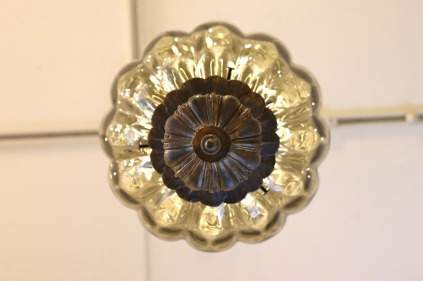 ガラスシェードと重なって揺らぎのある光りを演出してくれているのは、ガラスの中の筒状のパンチングシェードの仕業。クローバー型に切り取られた模様から電球の灯りが広がります。