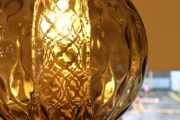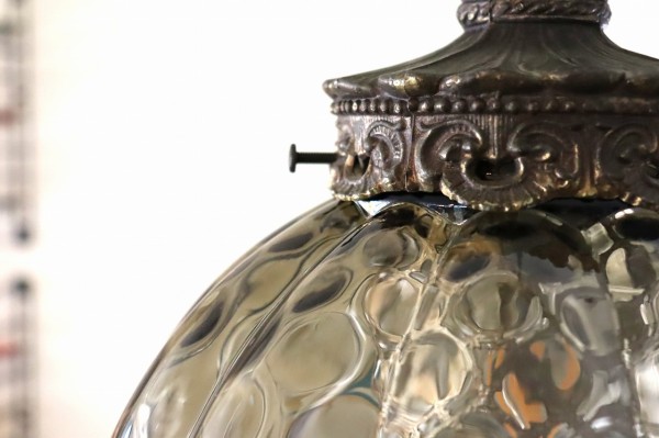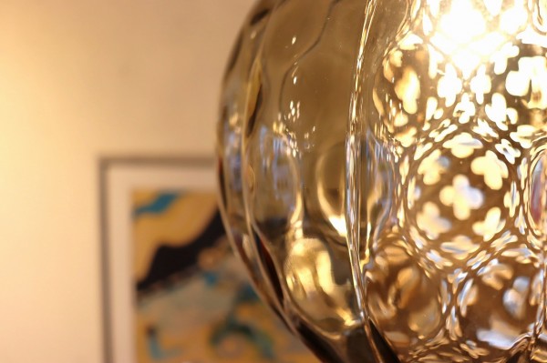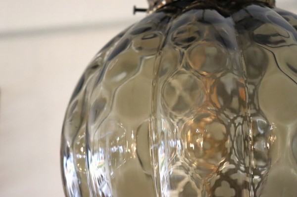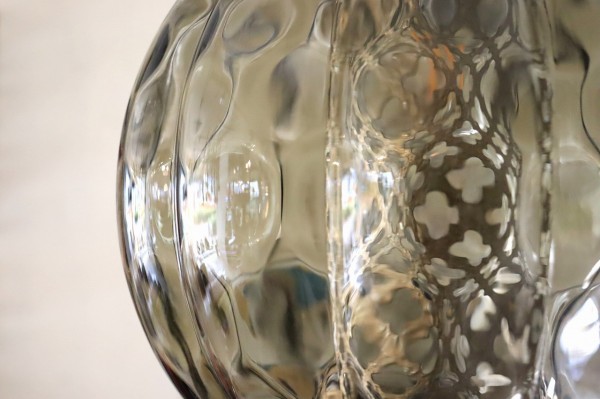 ガラスは球体の内側にほんのりエンボスがかかっていて、角が溶けた様なひし形模様に。ガラスだまりの濃淡が楽しめて深みのある佇まい。