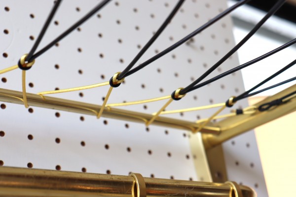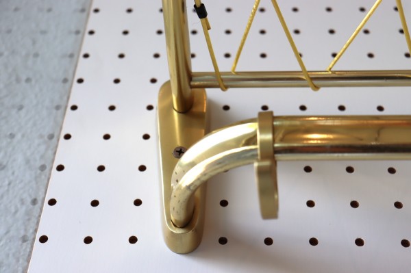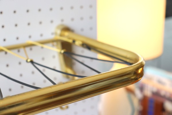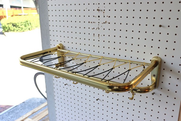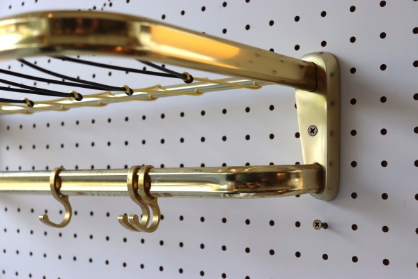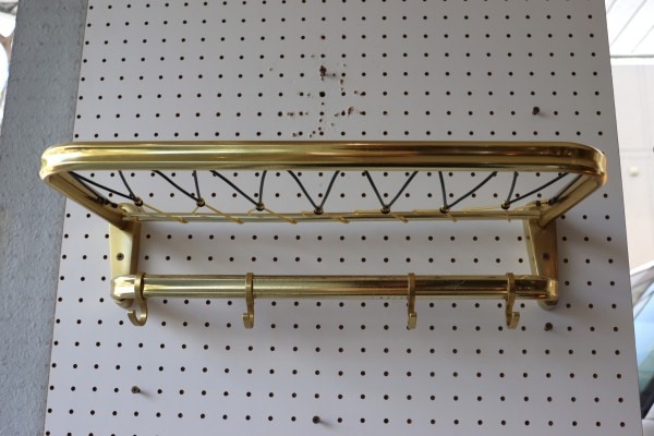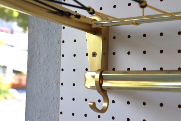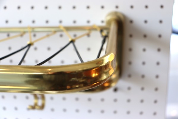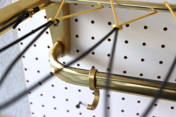 ウォールハンガー。ゴールドのフレームと樹脂製の紐で編んだ壁掛け仕様のハンガーラックです。