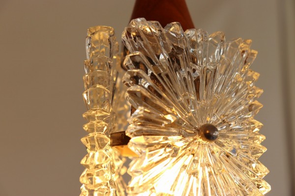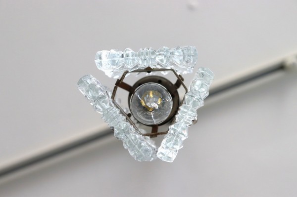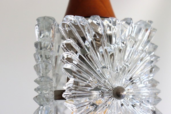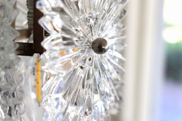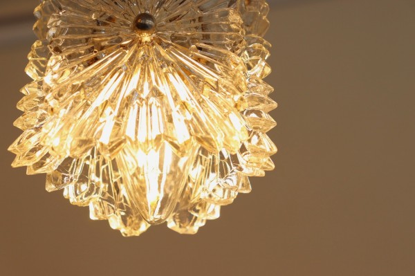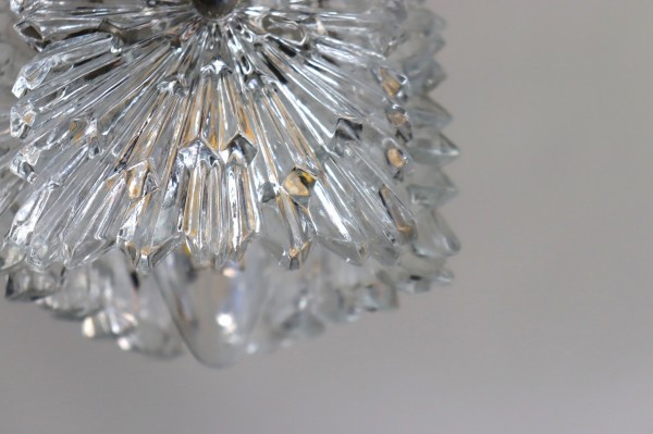 ガラスシェードは厚みのあるクリアガラスのプレートを3枚、三角形になるように合わせたデザインになっています。ガラスは雪の結晶のような美しく煌びやかなデザイン。細かな凹凸が感じられる丁寧なつくりです。