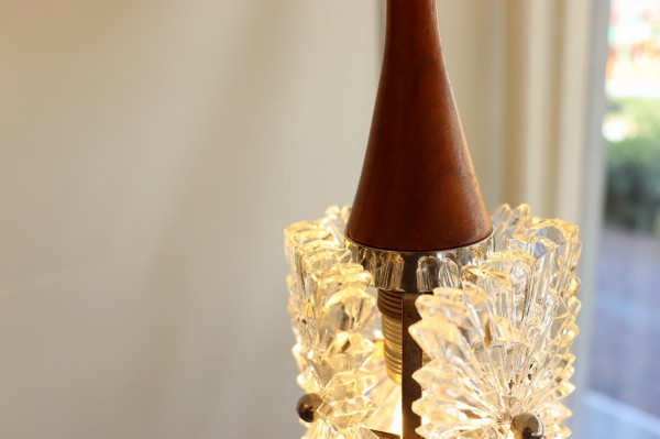 ガラスにウッドを合わせたモダンな雰囲気。三角形のシルエットはどこから見ても美しく綺麗に見えます。自然光でもカットガラスが綺麗に反射するので部屋の角の窓辺に設置して昼夜で違った光の煌めきを味わうのもよさそう。