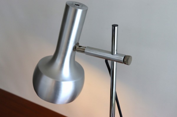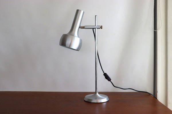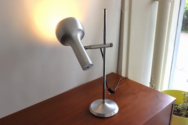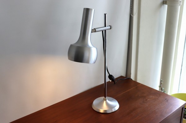 シルバーのデスクランプ。懐中電灯のような形のシェードが特徴的です。
