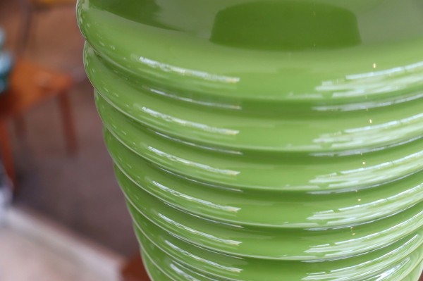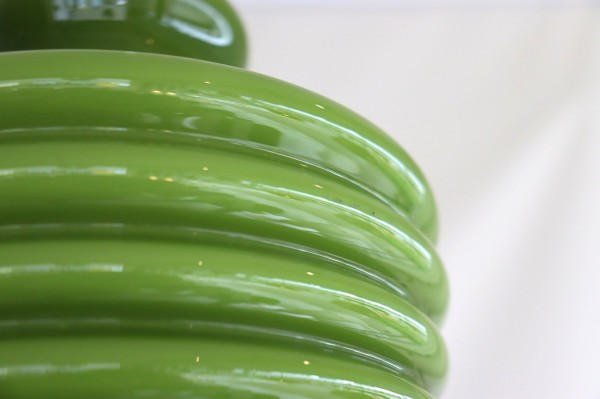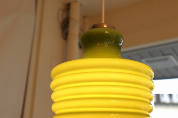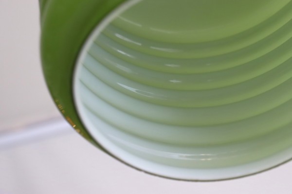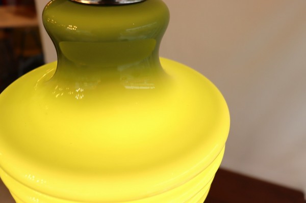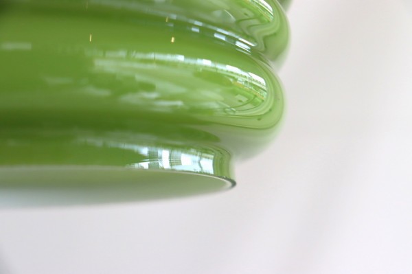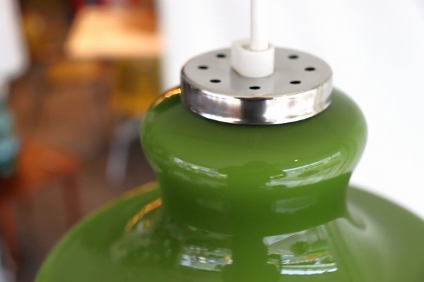 外側が落ち着いたトーンのグリーンで内側はミルクガラス。ガラスの艶やかな質感が上品で綺麗。点灯すると電球の灯りに照らされて黄緑色へ変化します。消灯時も点灯時もどちらも魅力的なランプです。