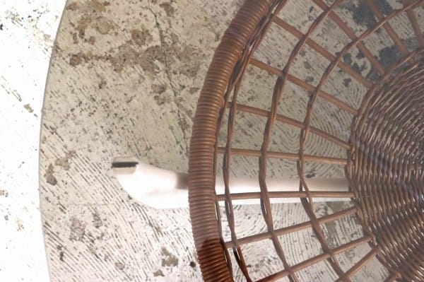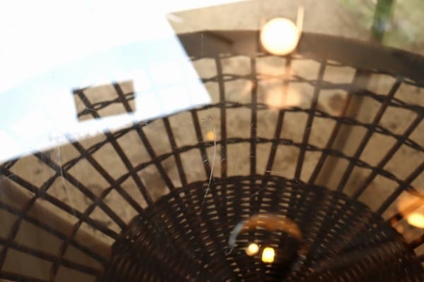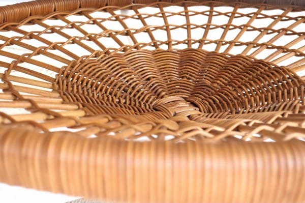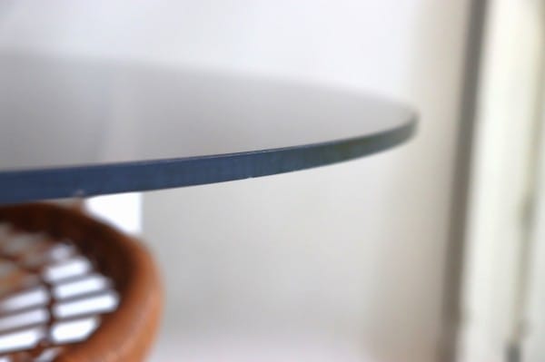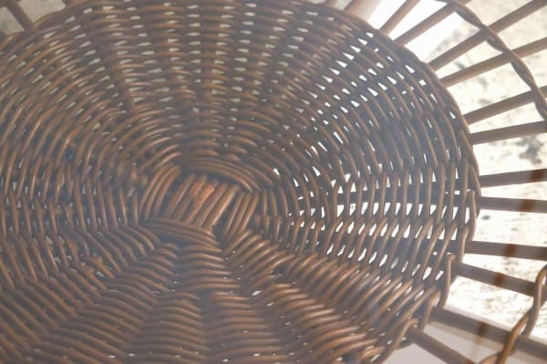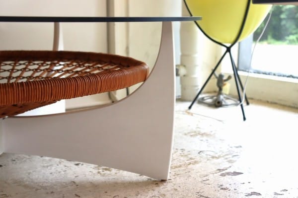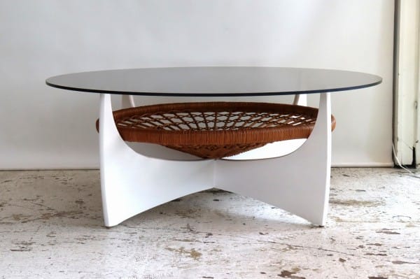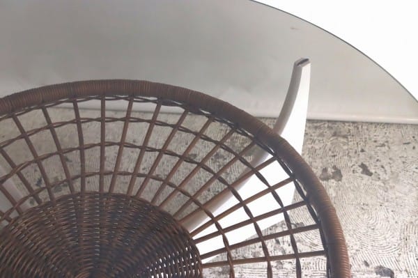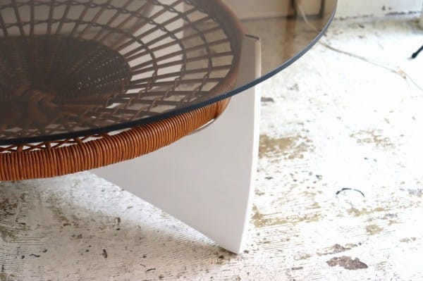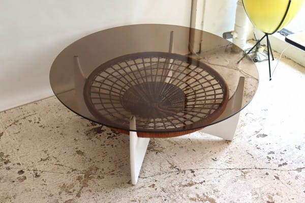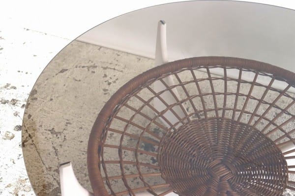 スモークガラスの天板と木製の白い脚、ラタンで編んだバスケットが付いた洒落たデザインのテーブルです。スモークの色合いが絶妙なブラウンのニュアンスで、こなれた雰囲気を醸し出しています。