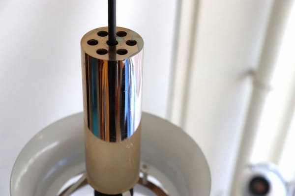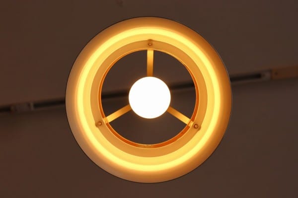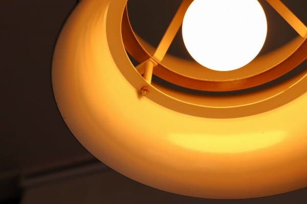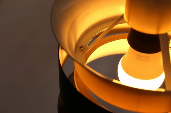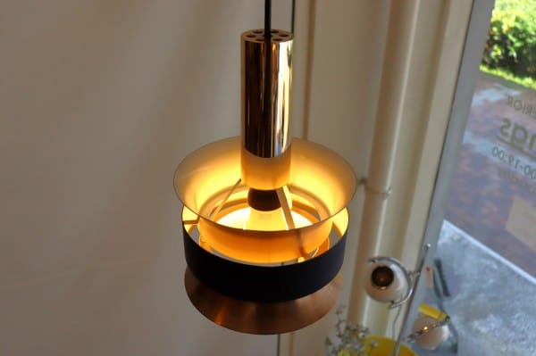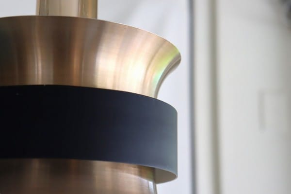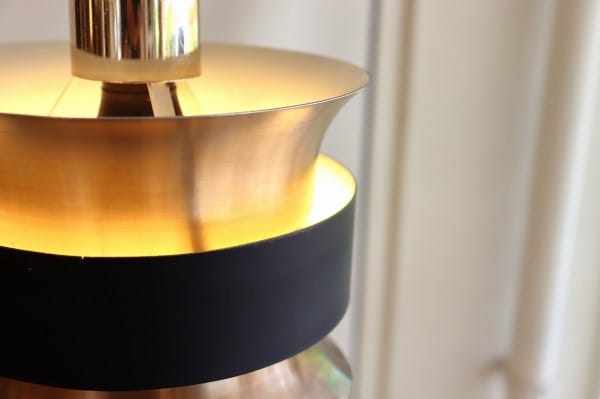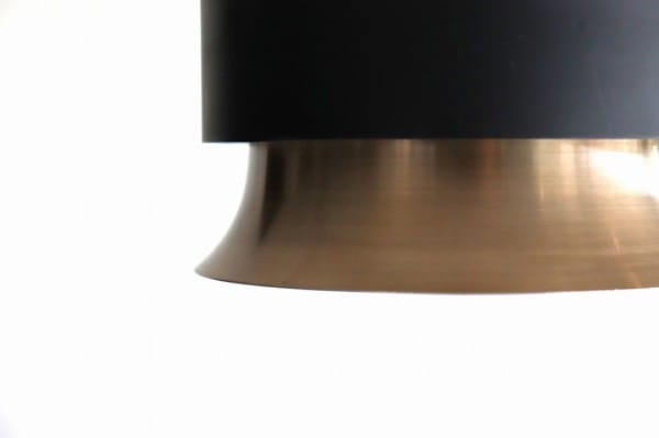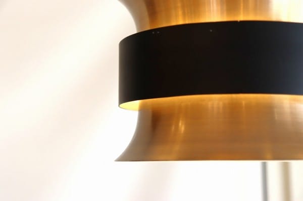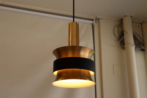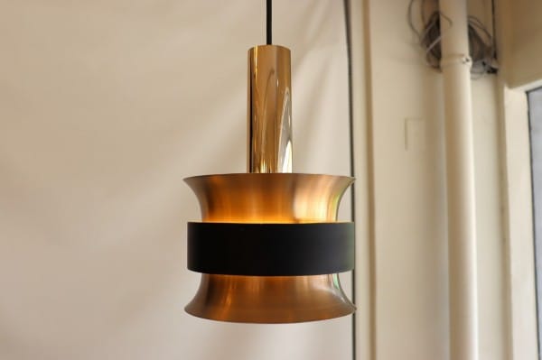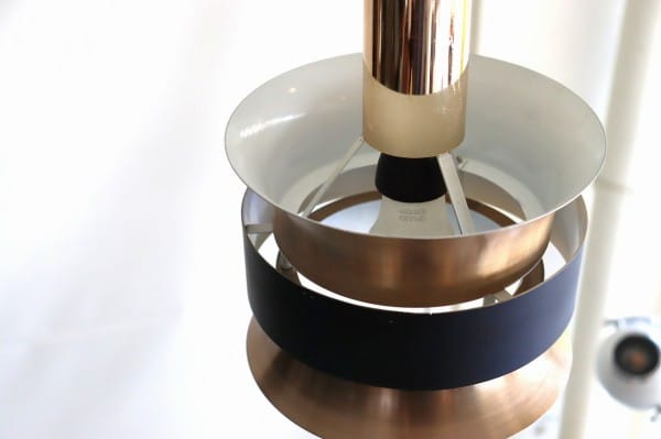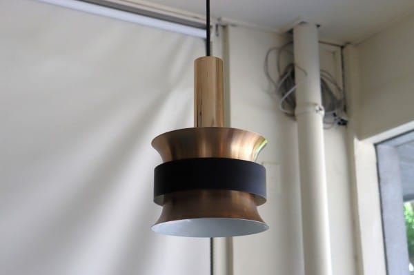 カッパー塗装の真ん中でくびれたシェードはとても美しく、真ん中にはベルトを締めるように黒い輪が重なっています。その隙間からの光を楽しむデンマークのビンテージランプらしいデザインですね。