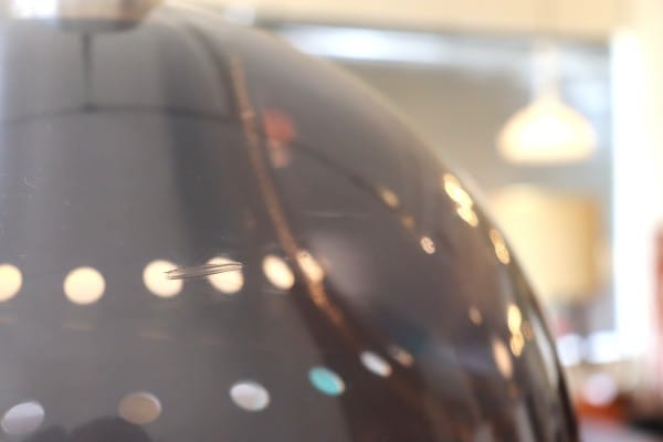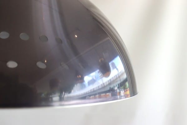 2種類のプラスチック樹脂製のシェードの組み合わせで、外側の半円型のシェードは透明感のあるスモーク、内側はAラインのシルバーのデザインです。異なったシルエットのシェードが重なっていて、視線の抜けが洒落ています。