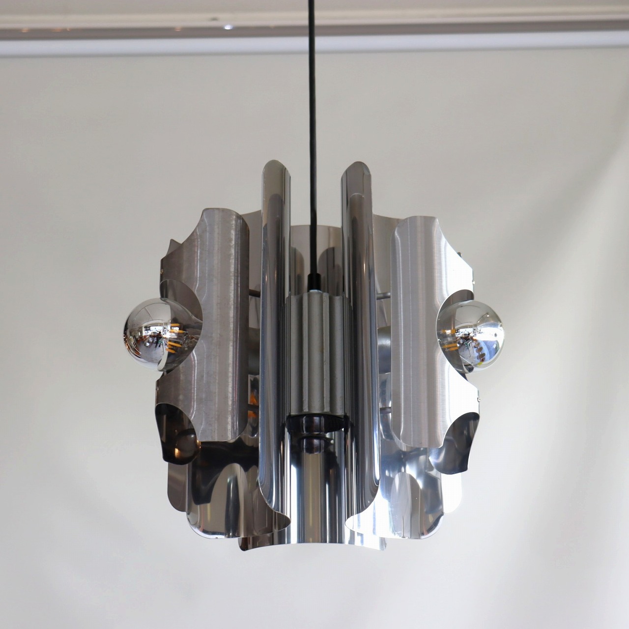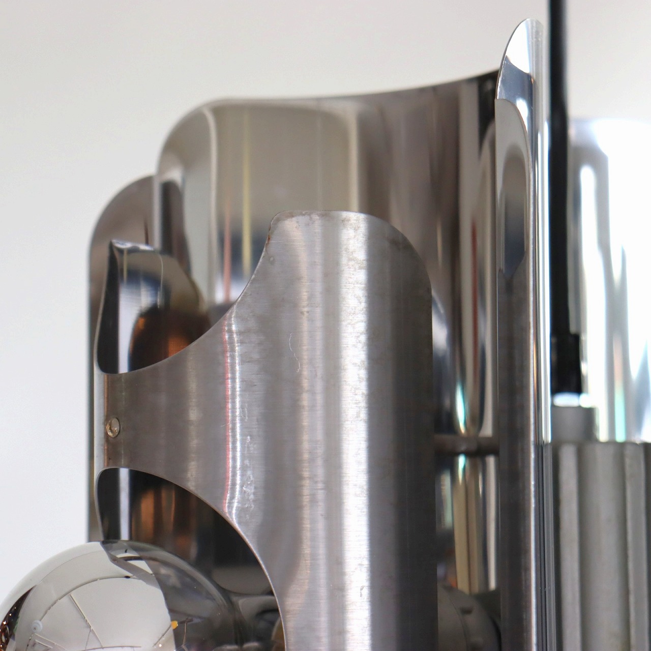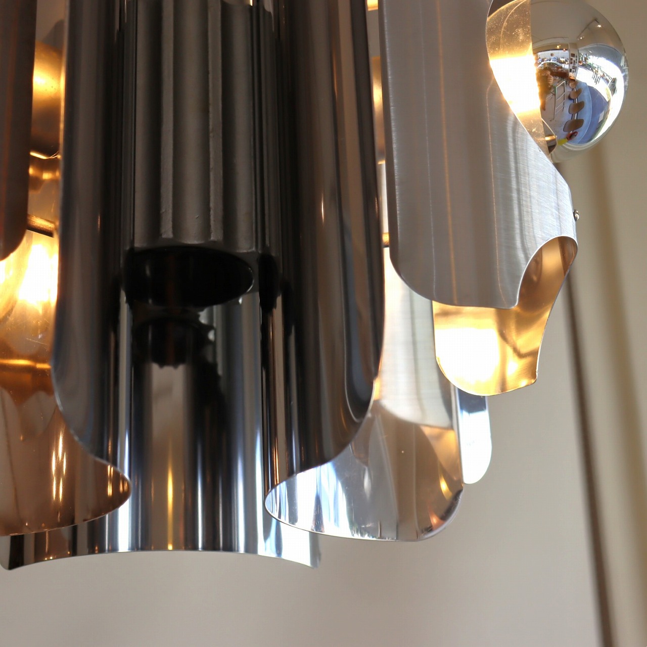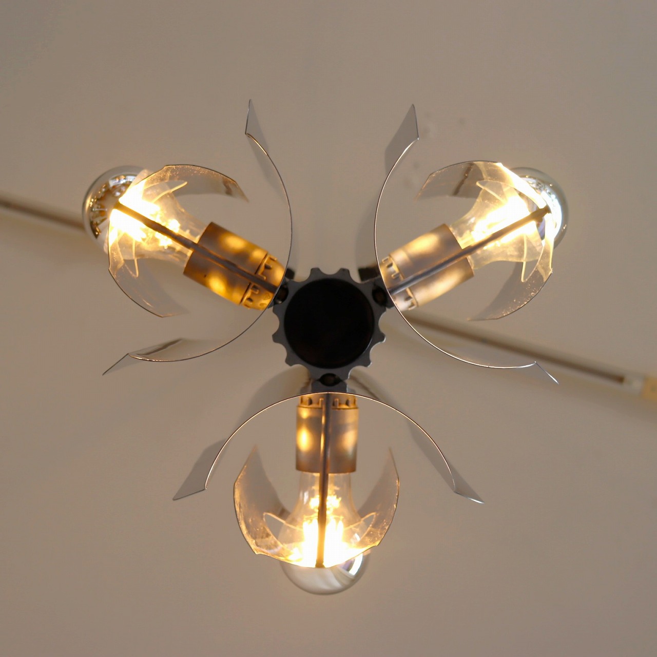 中心に軸となるパーツに、3つのクロームメッキ製のシェードの金属板が均等につけられています。シェードは綺麗な曲線に湾曲しており、個性的で唯一無二なデザインです。