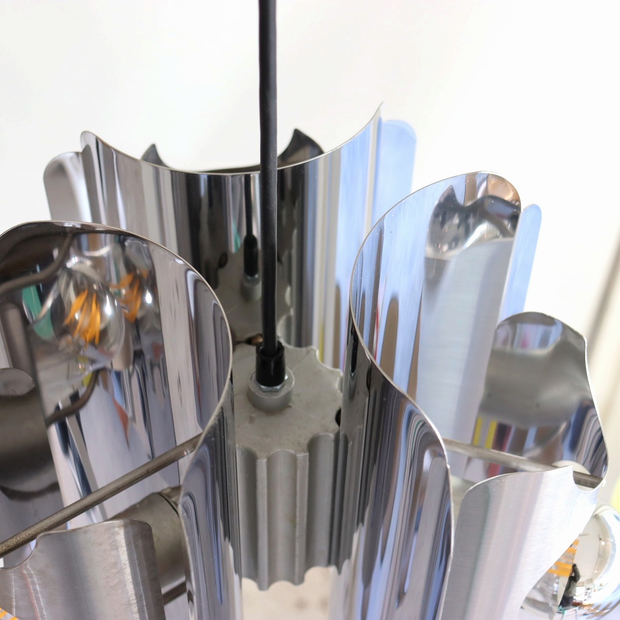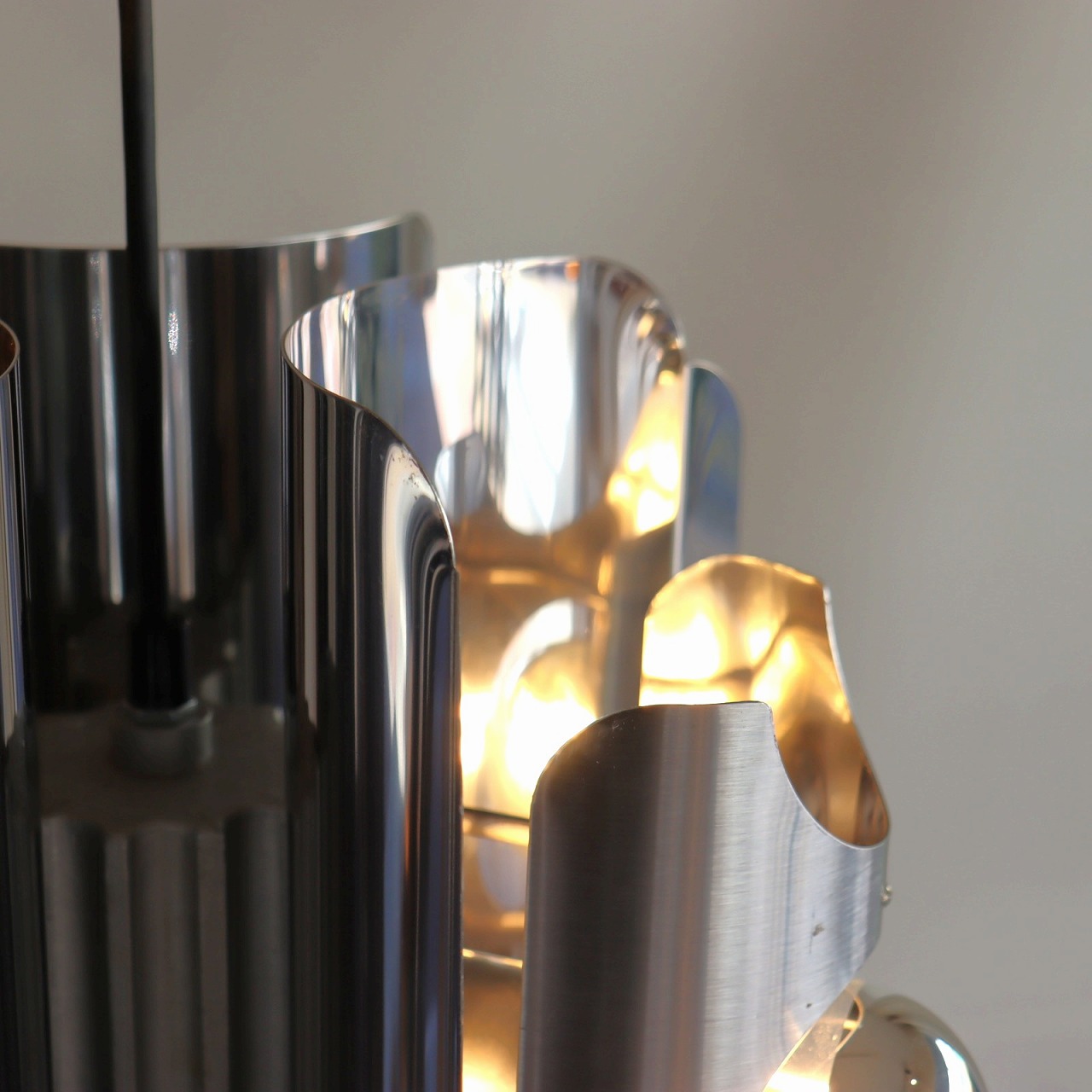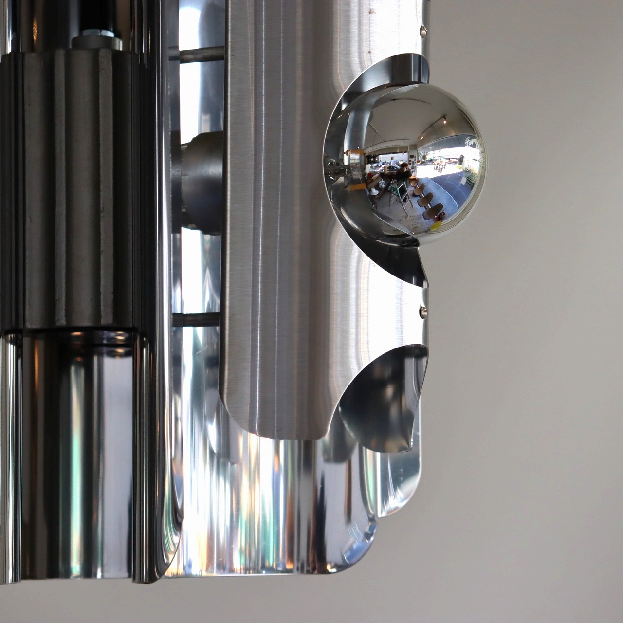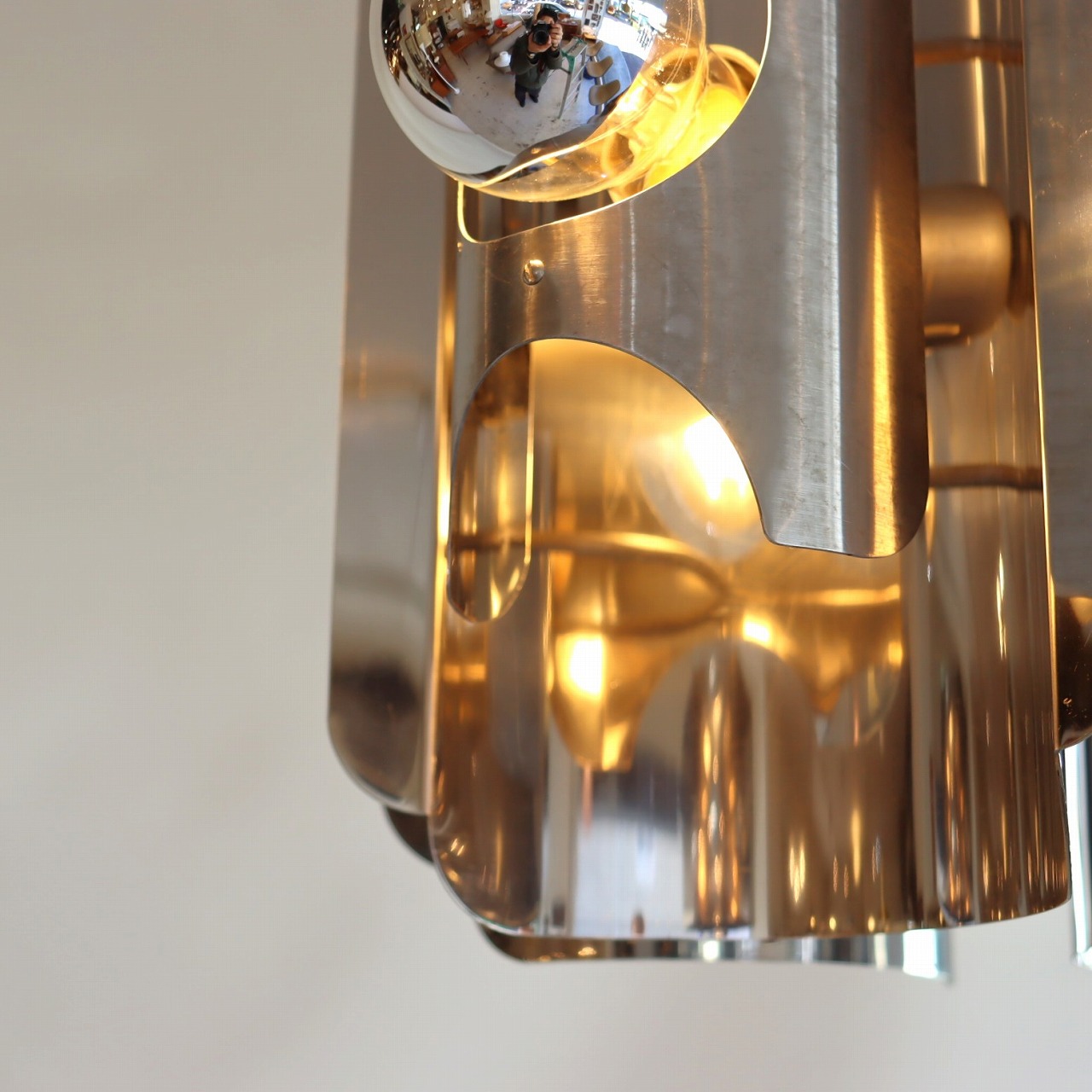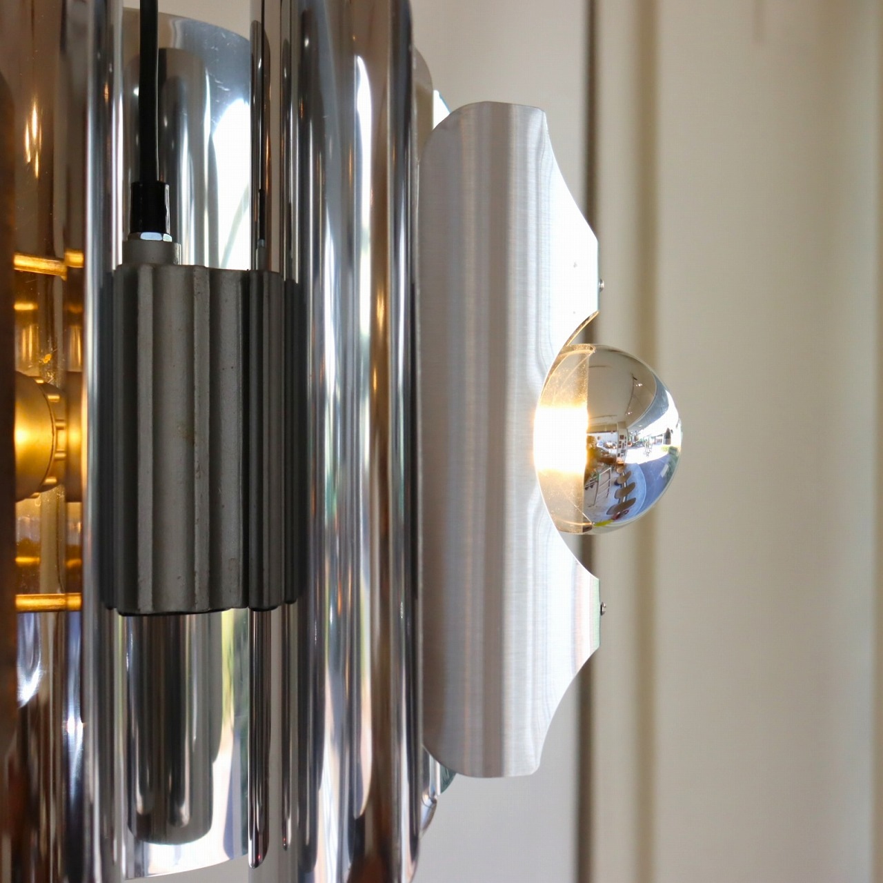 中心に軸となるパーツに、3つのクロームメッキ製のシェードの金属板が均等につけられています。シェードは綺麗な曲線に湾曲しており、個性的で唯一無二なデザインです。