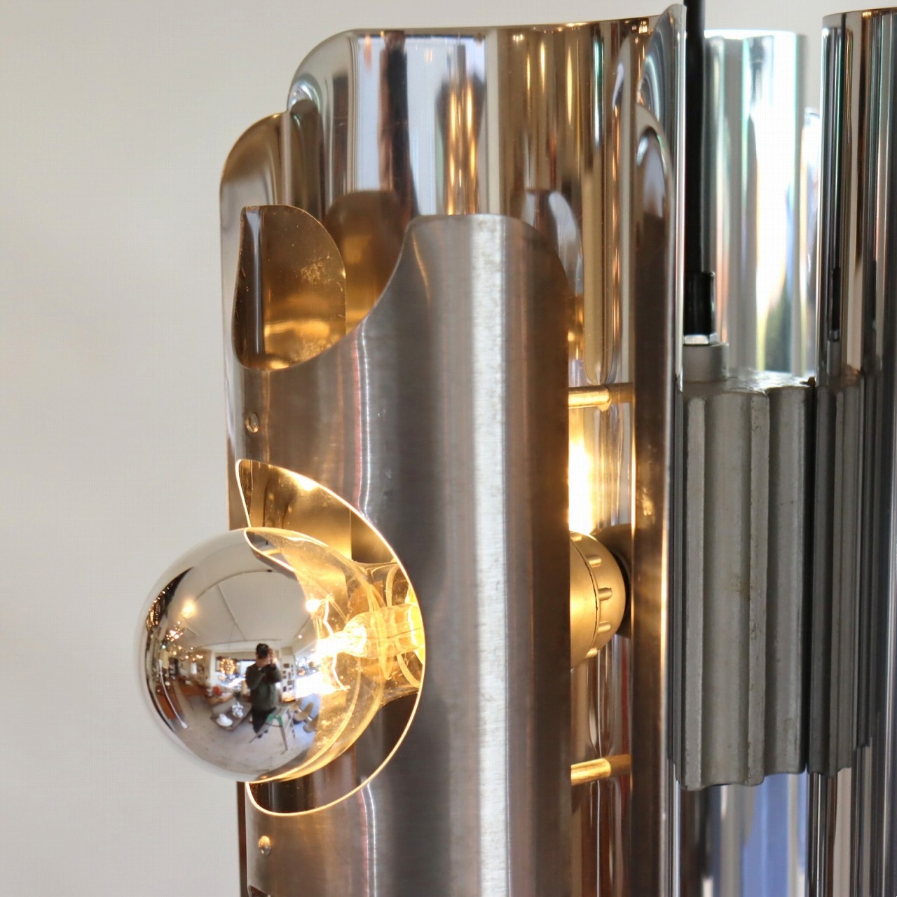 配線はメンテナンス済みで、電球はE26の白熱球やLEDがご使用いただけますが、熱を持ちにくいLEDがおすすめです。写真の電球はLEDのミラー球を使用しております。