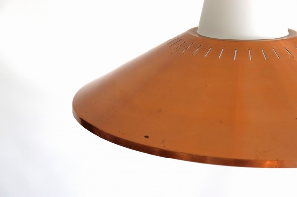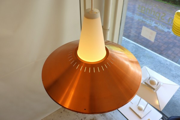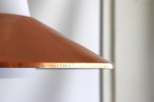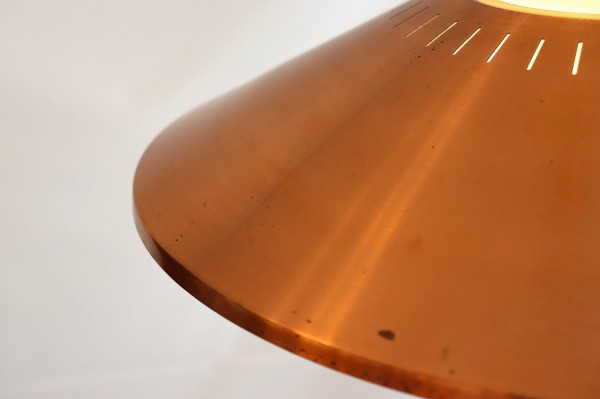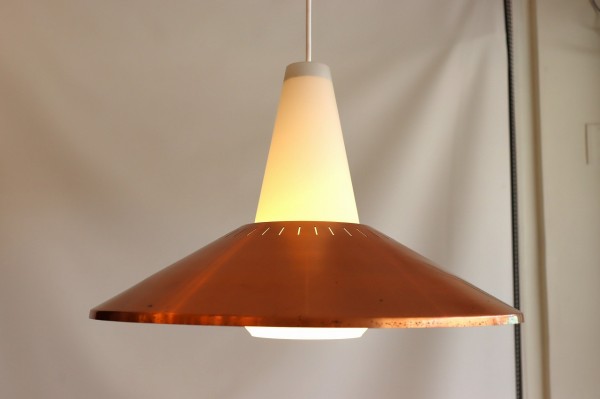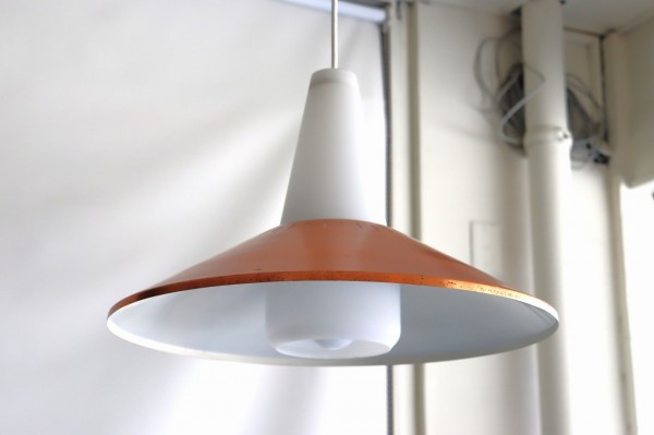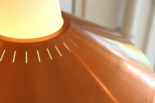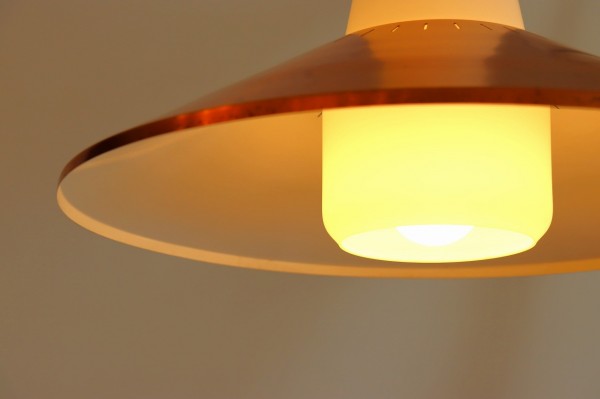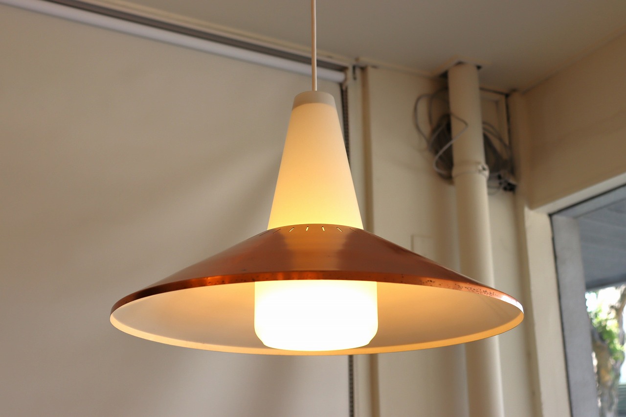 フロスト加工されたガラスシェードと傘のようなカッパーシェードの組み合わせのデザインです。シンプルながら整えられ、考え抜かれた造形美が感じられます。