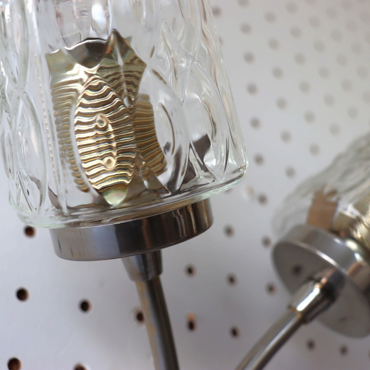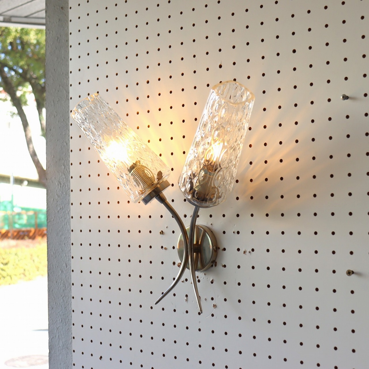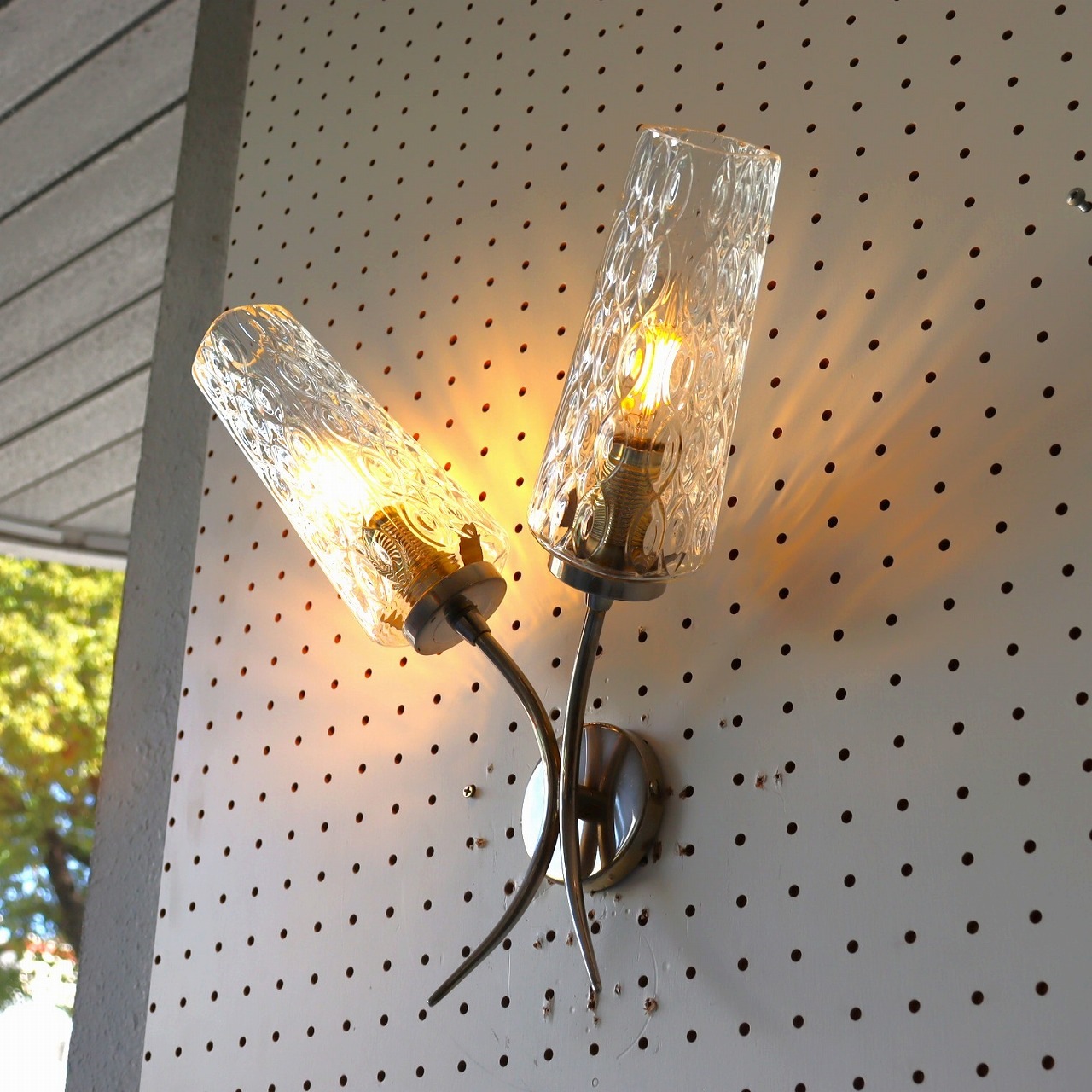 2灯ガラスブラケットランプ。ガラスシェードが2つついた壁付けのランプ。