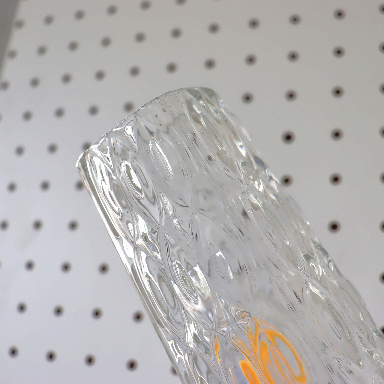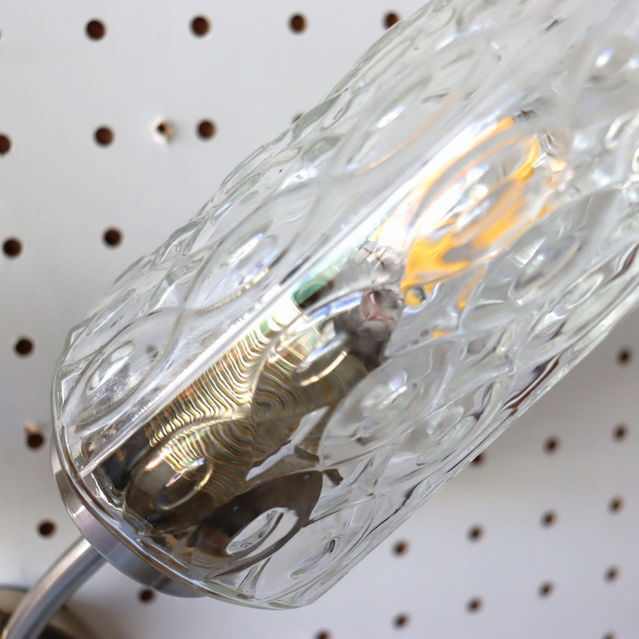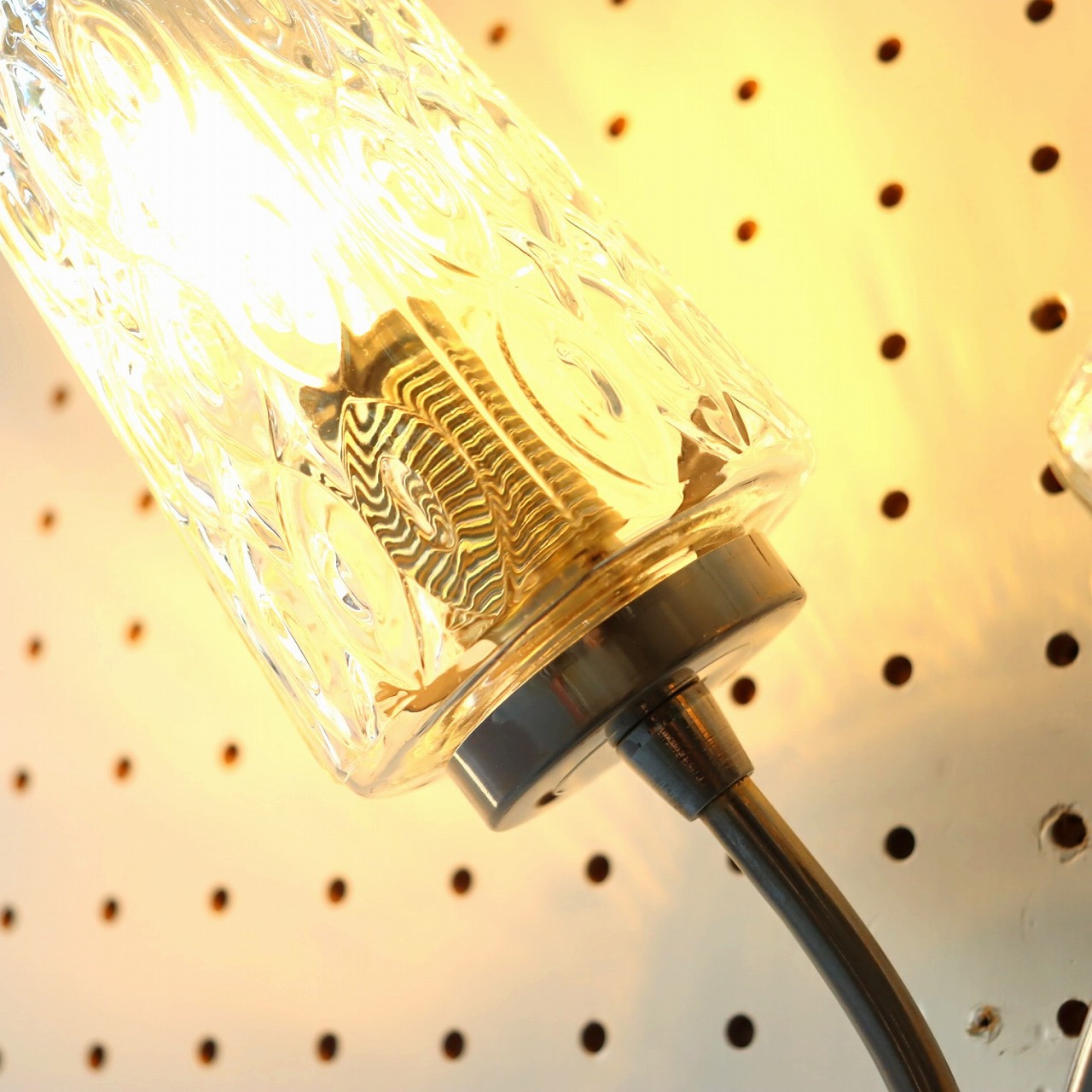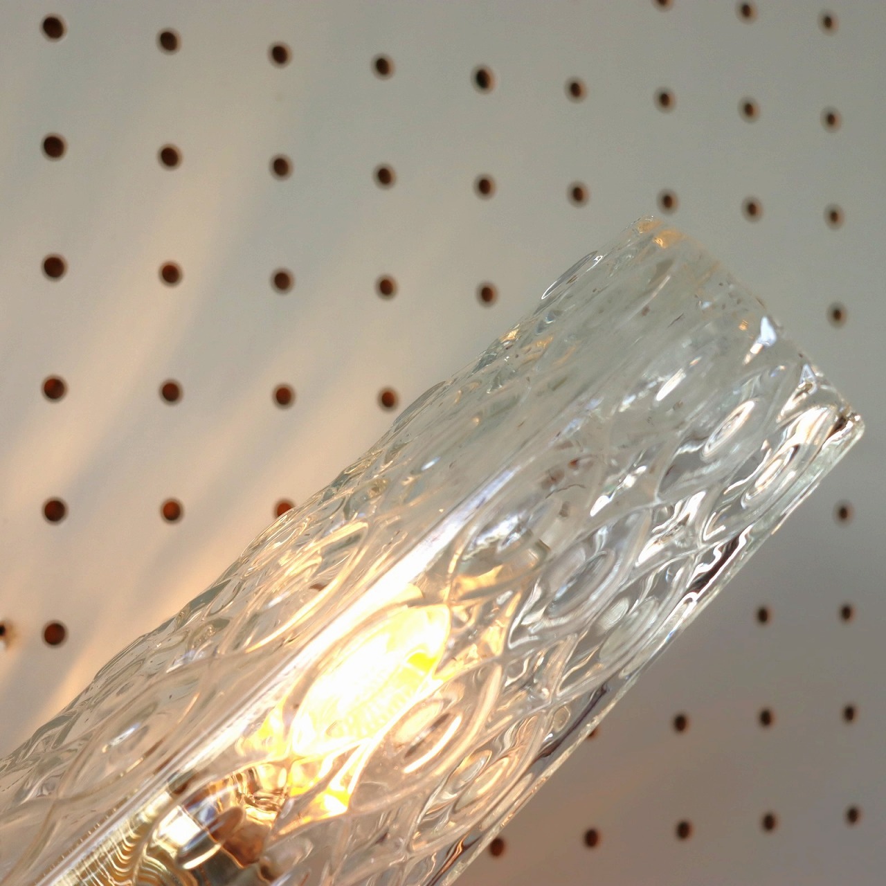 ガラスシェードは丸みのある少し窄まったシルエット。クリアガラスに波のような揺らぎのあるデザインで点灯時と消灯時、どちらも魅力的です。