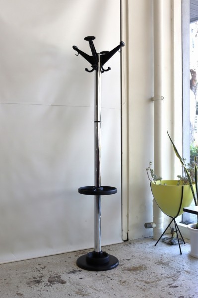 コートハンガー。コートなどを掛けるフックと傘立てが一体になったスタンド式のラック。
