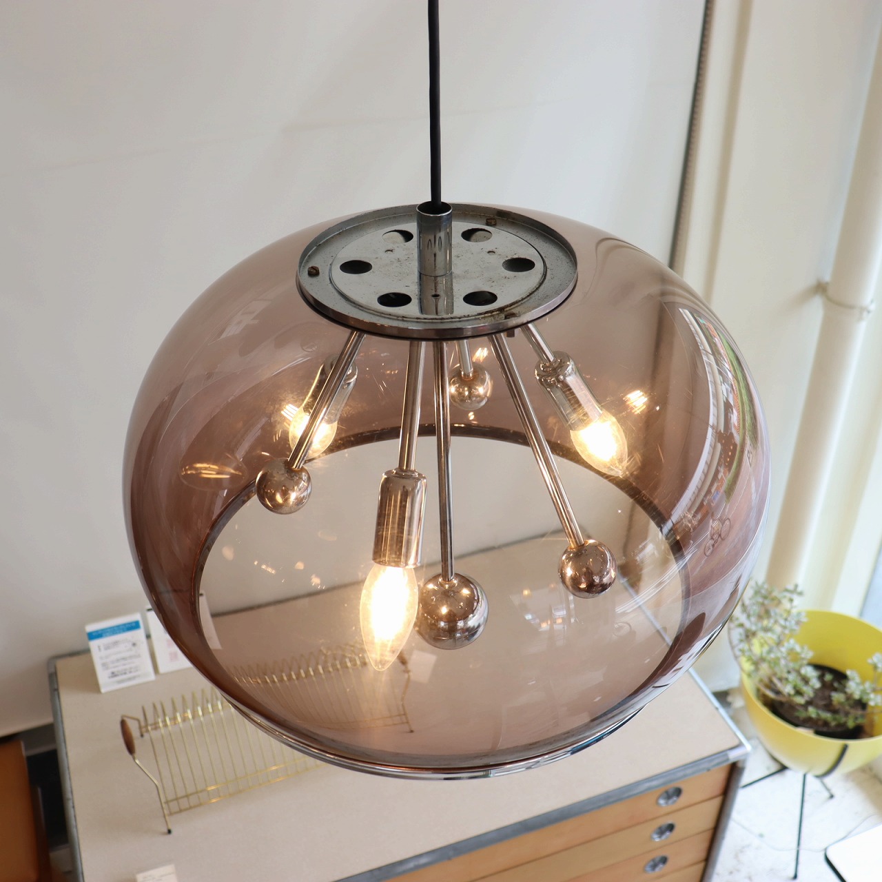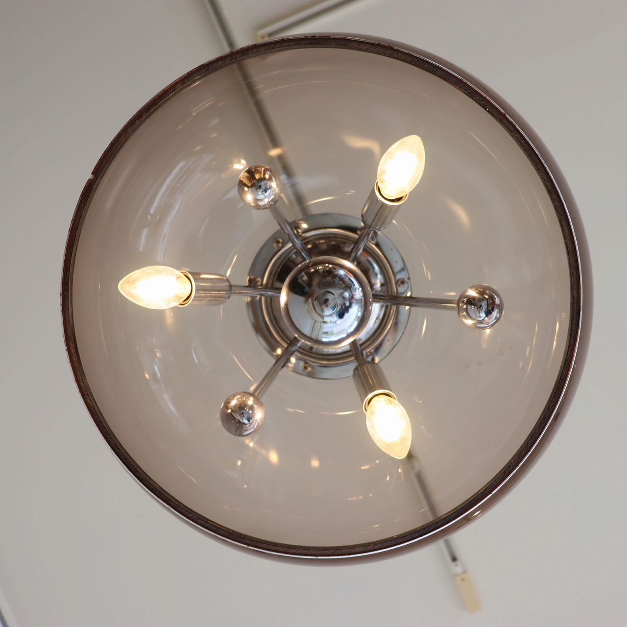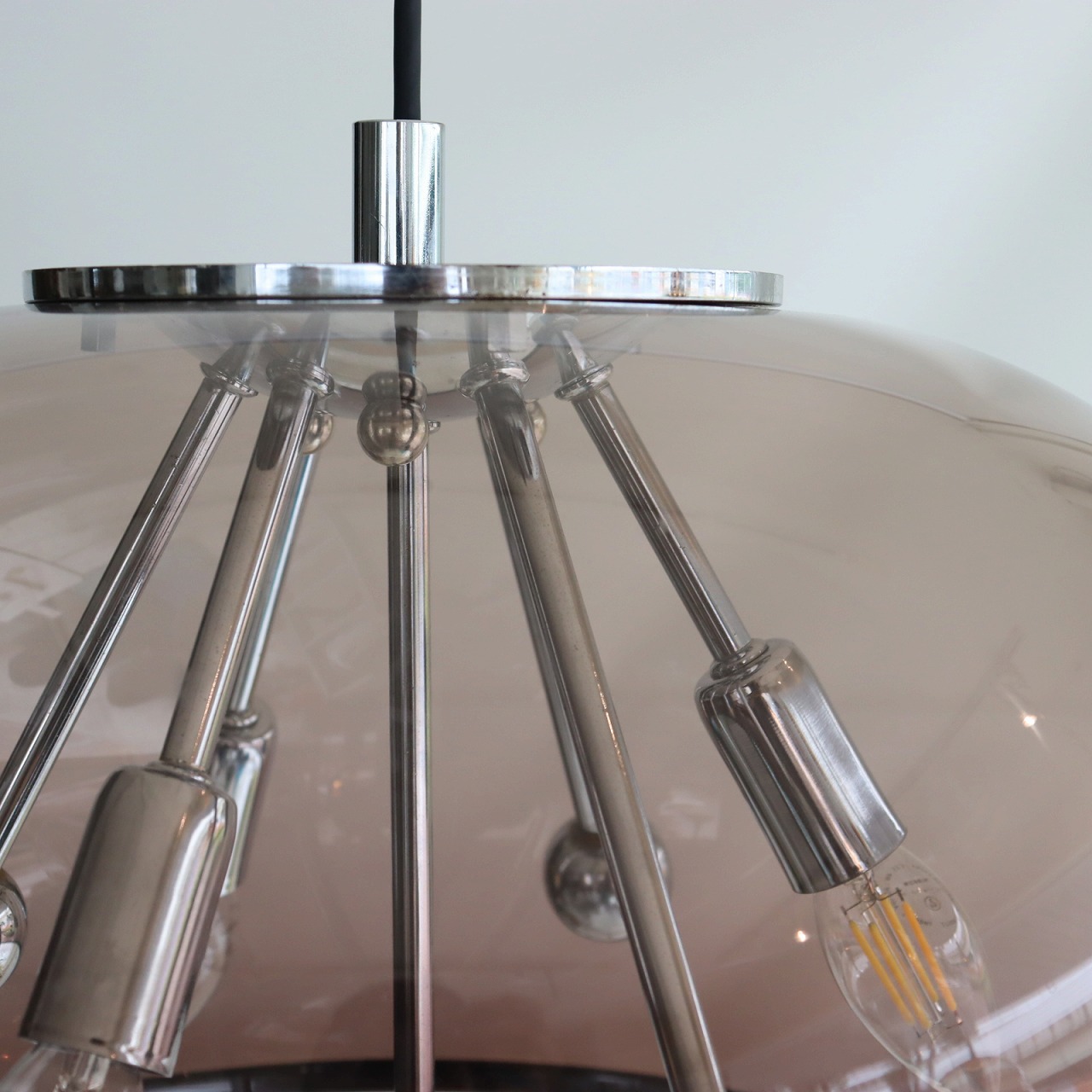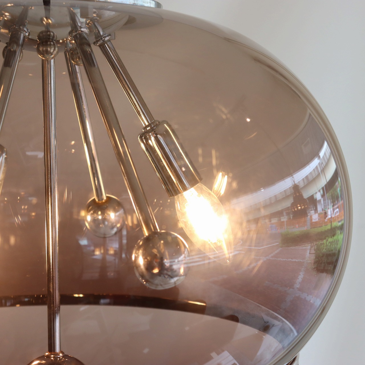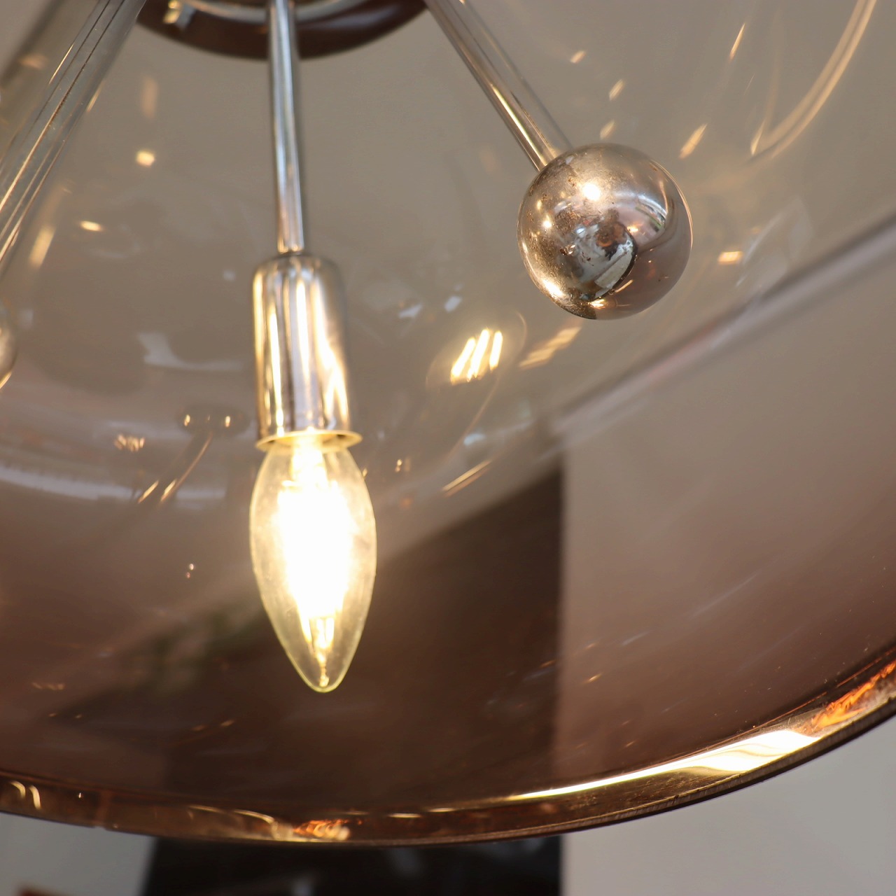 透明感のある楕円形の球体のスモークシェードの中に、クロームメッキのスポークの先にソケットが付いたランプ。アトミックなデザインが目を惹きます。