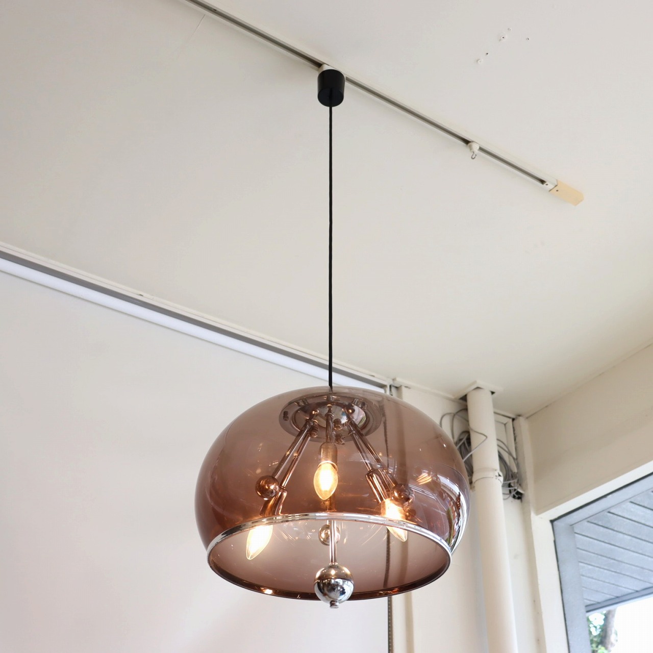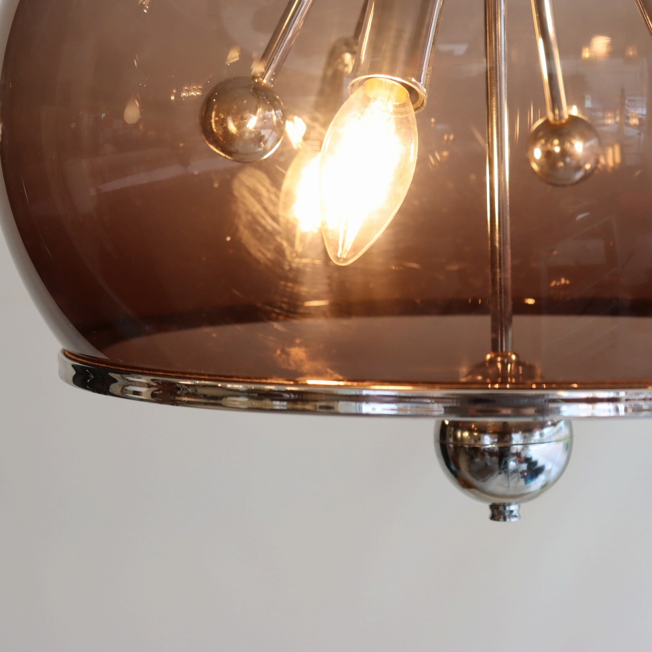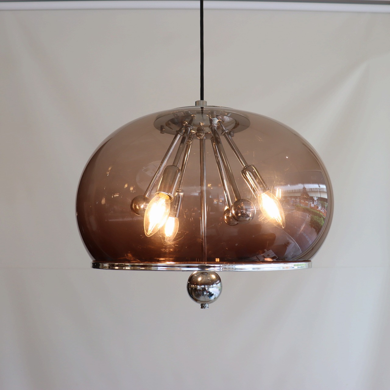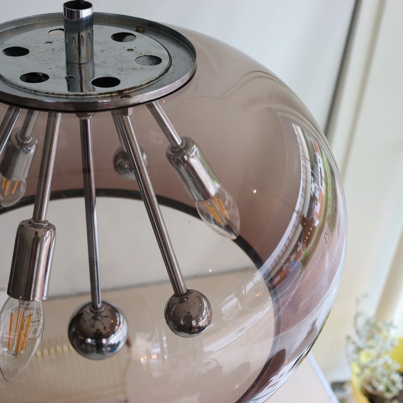 透明感のある楕円形の球体のスモークシェードの中に、クロームメッキのスポークの先にソケットが付いたランプ。アトミックなデザインが目を惹きます。