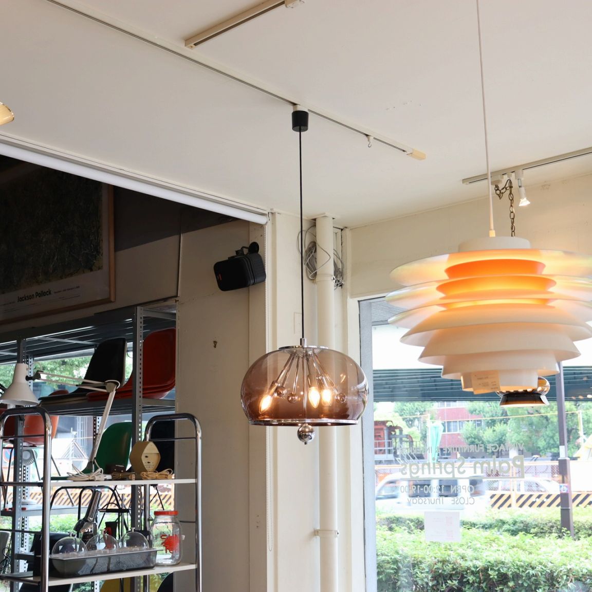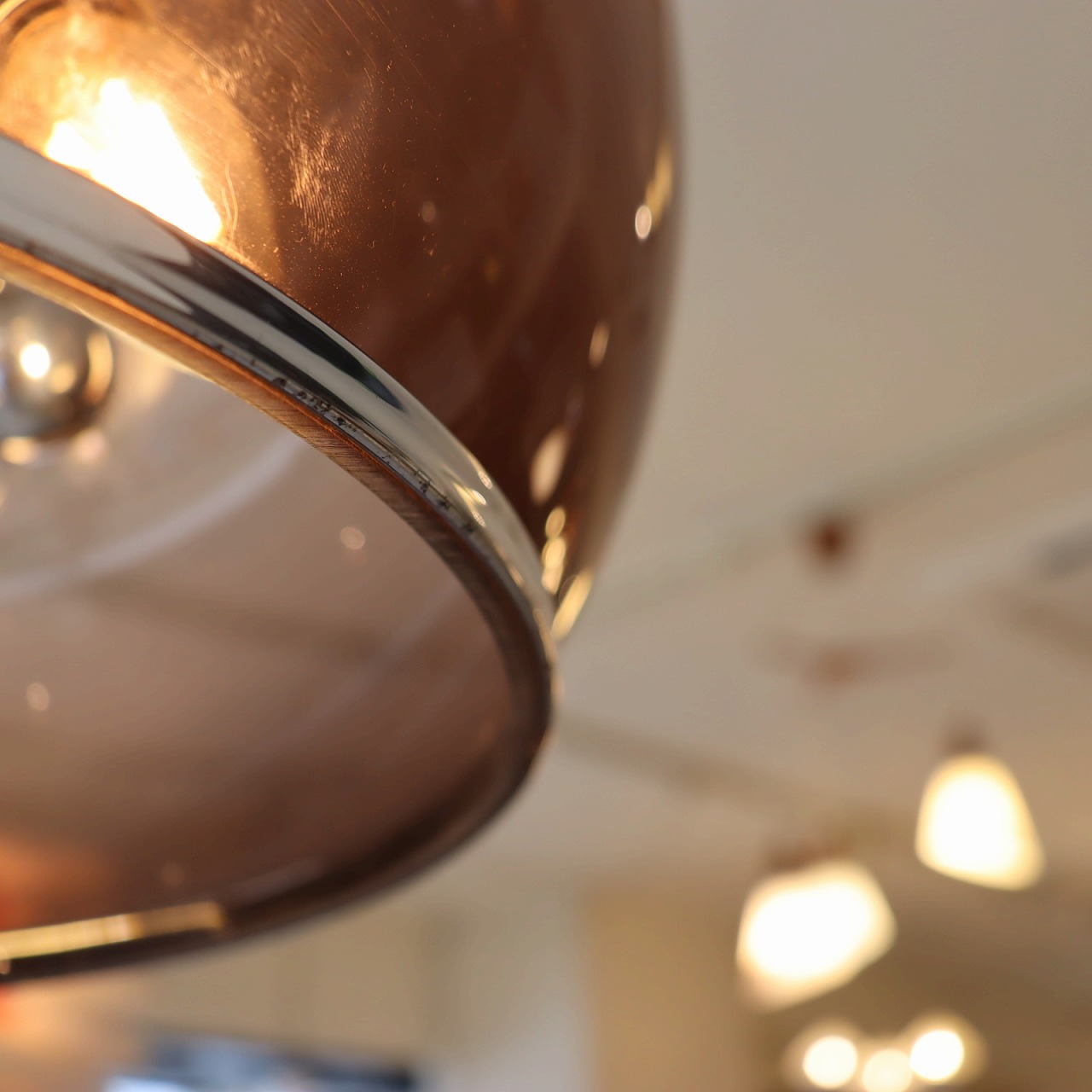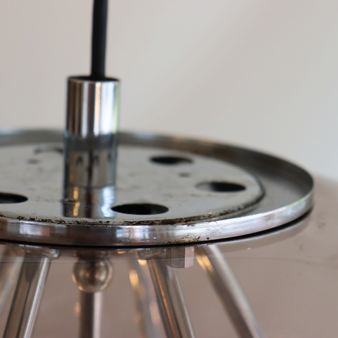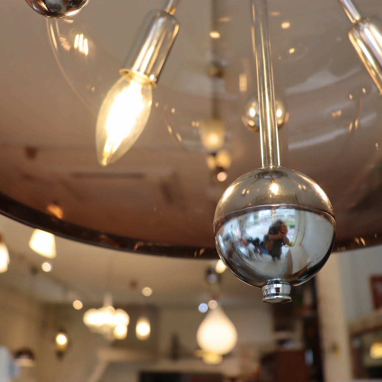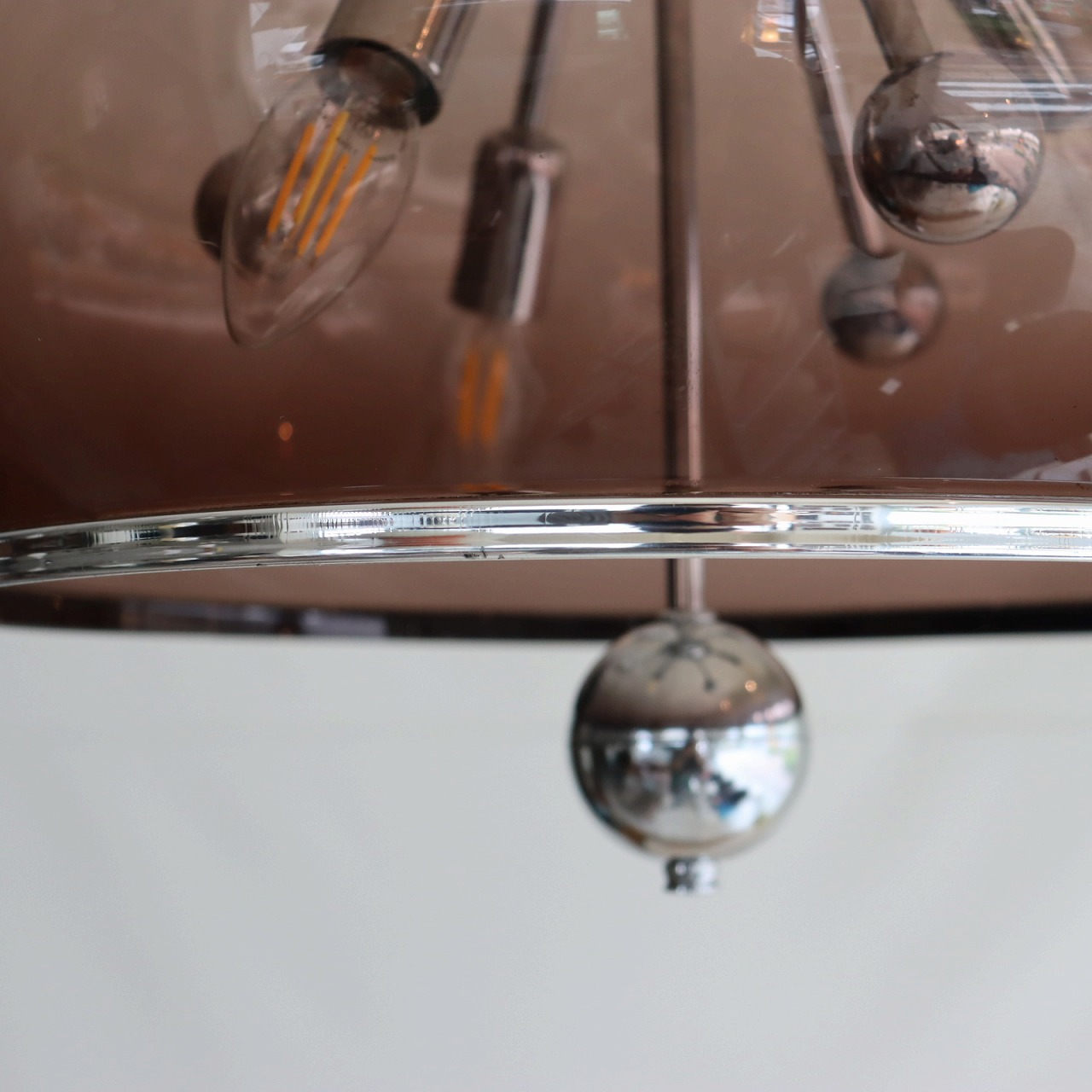 透明感のある楕円形の球体のスモークシェードの中に、クロームメッキのスポークの先にソケットが付いたランプ。アトミックなデザインが目を惹きます。